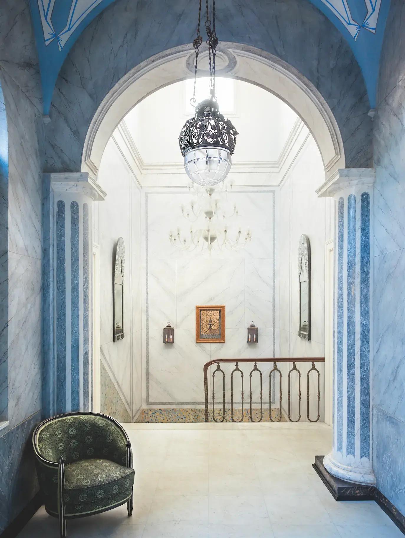 В коридоре, который ведет к спальням, стены декорированы мрамором, а рядом с аркой висит фонарь из кованого железа и стекла с гравировкой. На лестнице — люстра из муранского стекла.