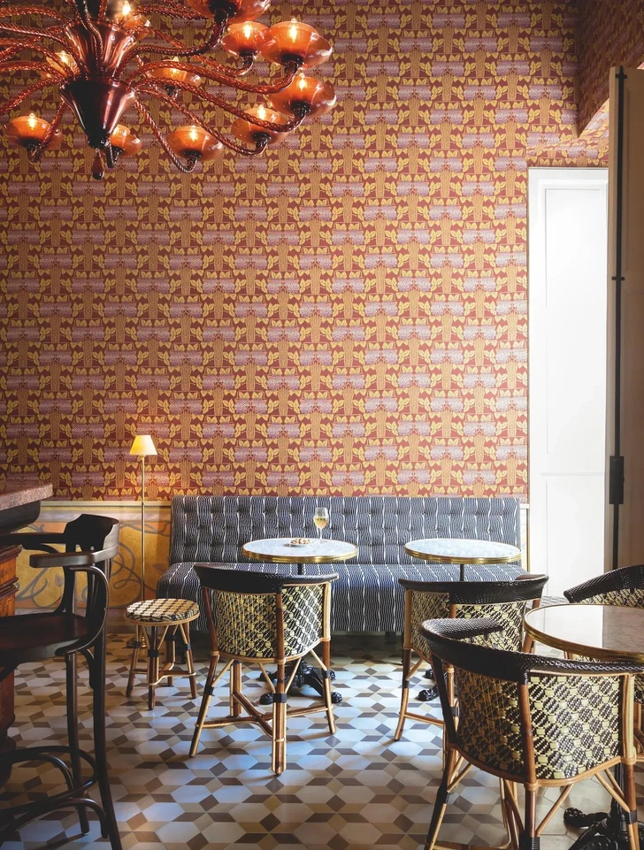Стены в баре обиты тканями Le Manach с шелковым рисунком 1925 года. Кофейные столики и плетеные стулья от Maison Drucker. Потолочный светильник выполнен из муранского стекла.