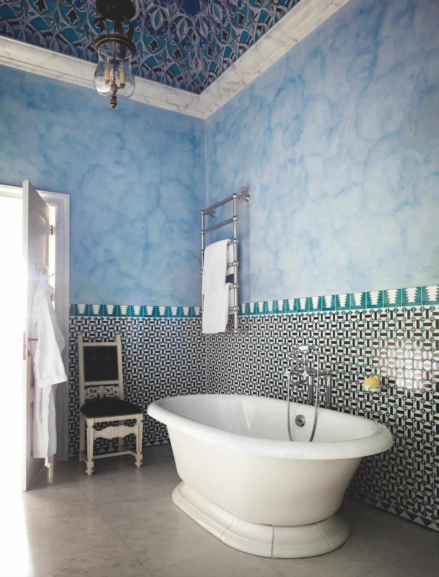 В ванной комнате стоит ванна, купленная в Соединенных Штатах. Плитка в восточном стиле выполнена итальянскими мастерами.