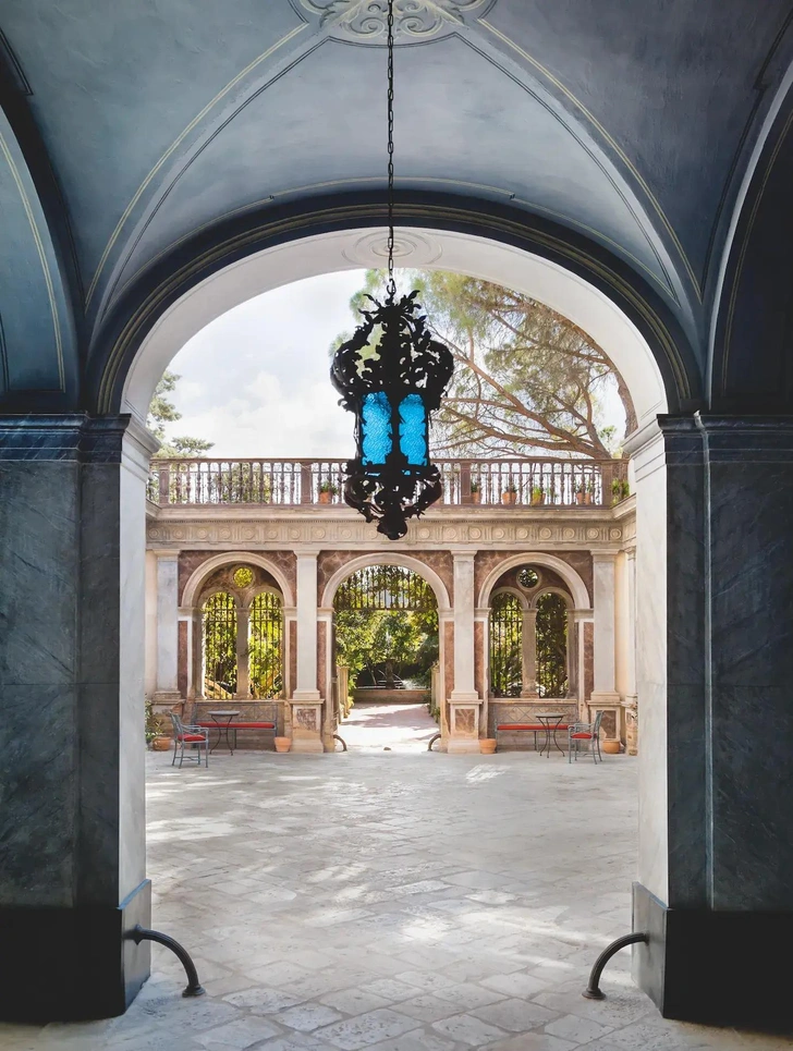 Фонарь из кованого железа подвешен в арке внутреннего двора палаццо с видом на сад. Садовые кресла и скамейки, Tectona.