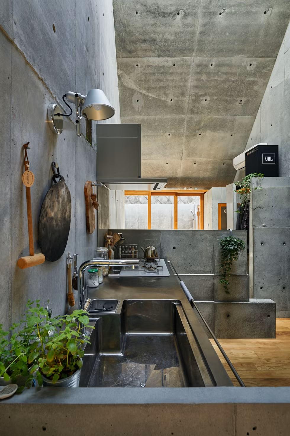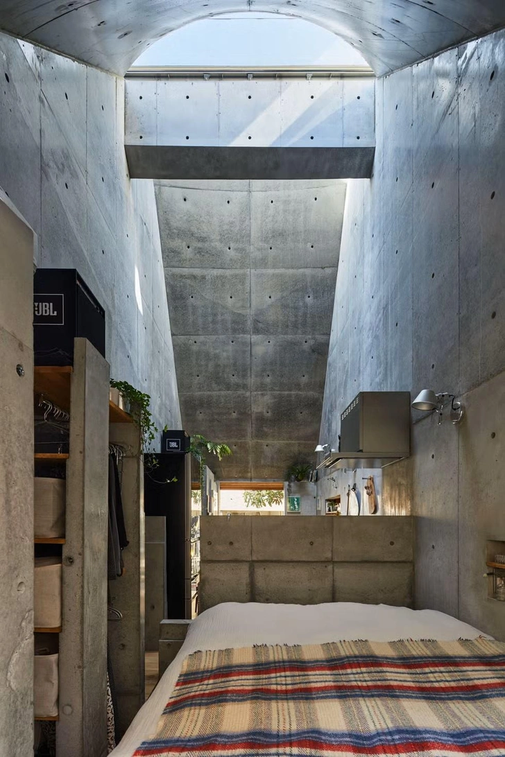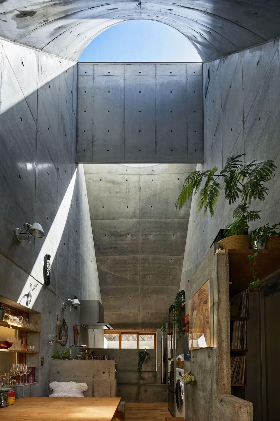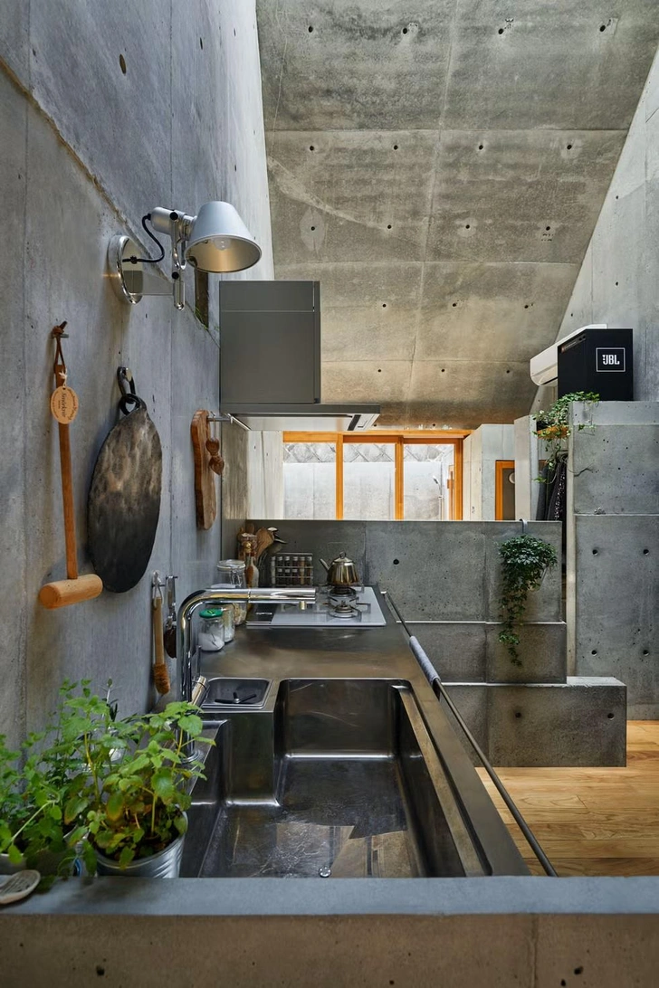 Конструктивно дом представляет собой монолитное бетонное строение, где несущие элементы одновременно выполняют декоративную функцию. Внутреннее пространство разделено на три основные зоны: обеденную зону, кухню и спальню. Все перегородки сделаны минимальной толщины, чтобы сэкономить полезную площадь.