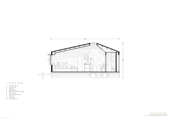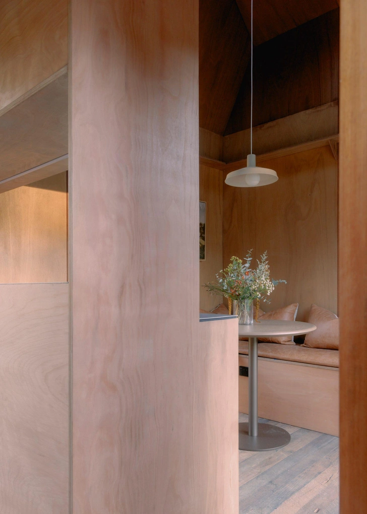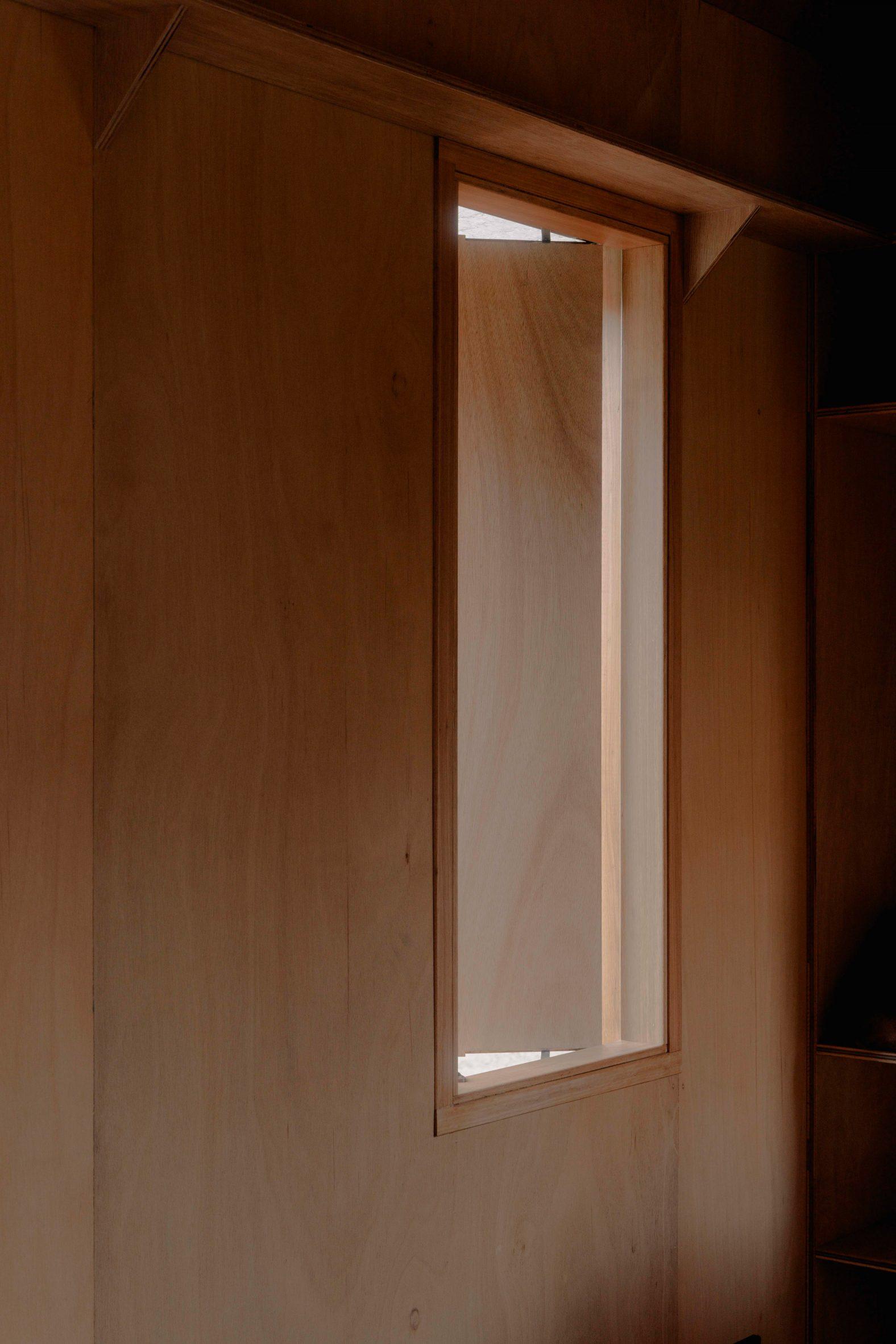 В торце расположен санузел и кладовая с двумя входами. Внутренняя отделка из фанеры создает целостное и спокойное пространство. А для внешней отделки выбраны прочные и простые материалы — дерево и гофрированный металл, внутри — теплая фактура фанеры.