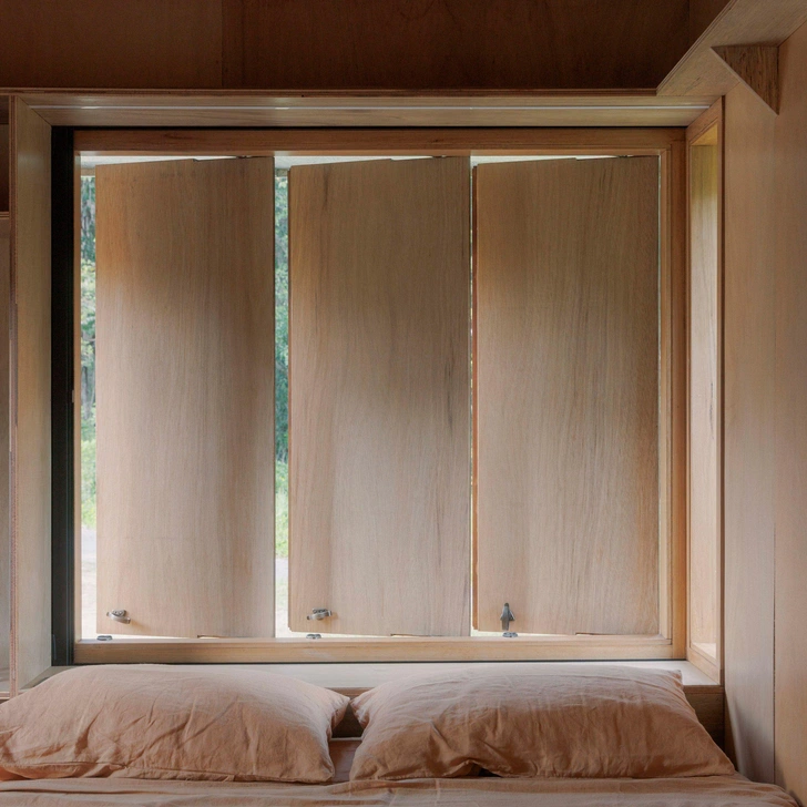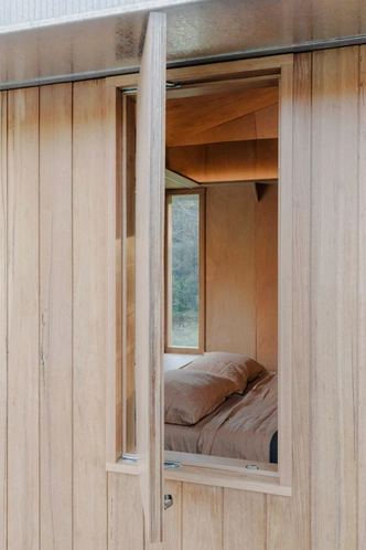 Несмотря на мобильность, дом спроектирован с учетом энергоэффективности. Его рекомендуется правильно ориентировать по сторонам света. Большие фанерные ставни контролируют свет и воздух, а раздвижная стеклянная стена открывает доступ на террасу под складным навесом, который убирается при транспортировке.