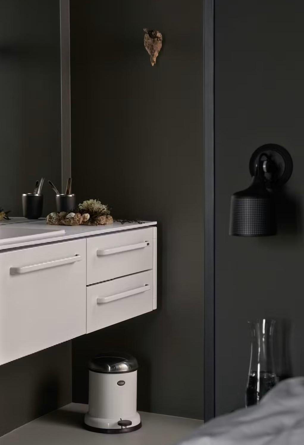 В ванной комнате преобладают темные тона, создающие контраст с белыми элементами.