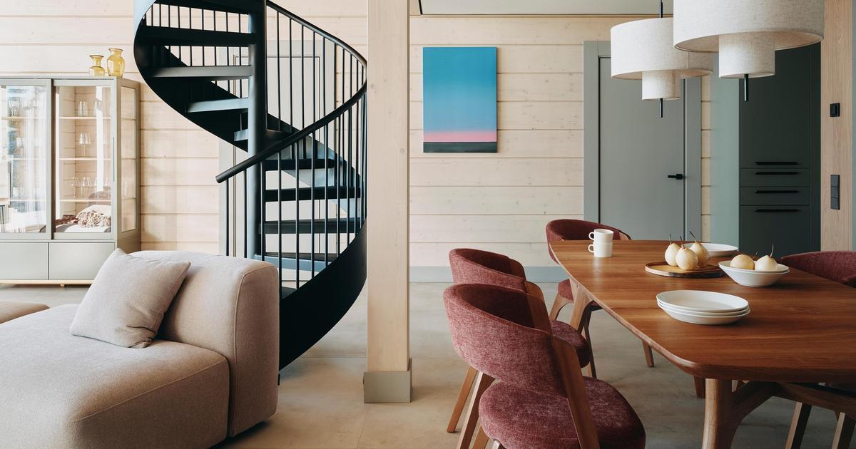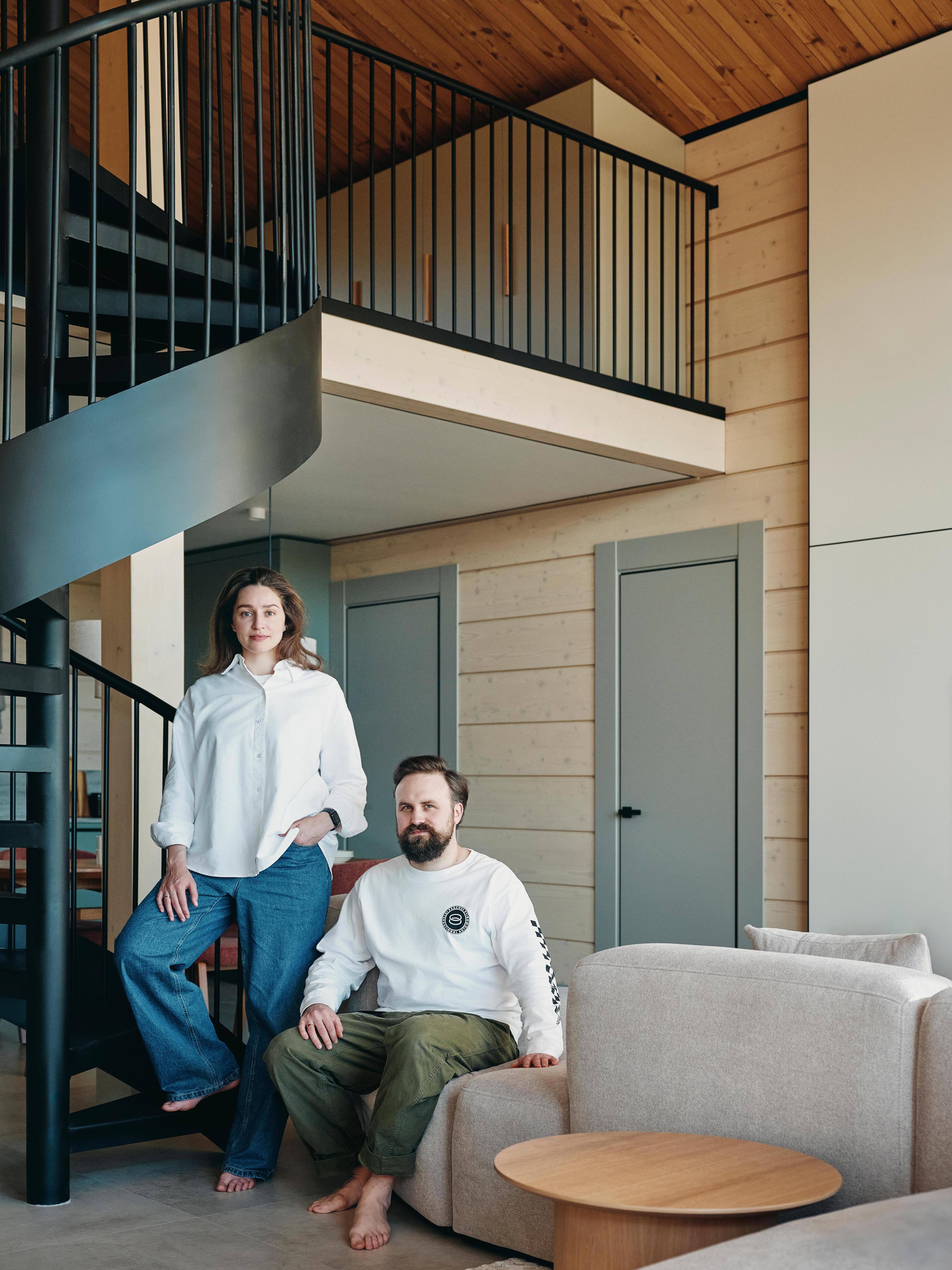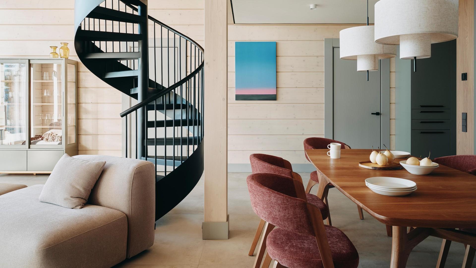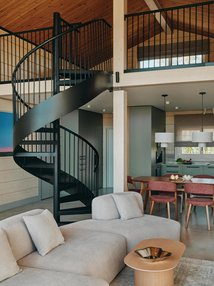 Ключевым акцентом стала винтовая металлическая лестница на гнутой тетиве — кроме своей понятной функции она усиливает выразительность пространства, это не просто второстепенный элемент. Хоть и далась она нам с большим трудом, мы рады, что все получилось именно так, как мы задумывали.