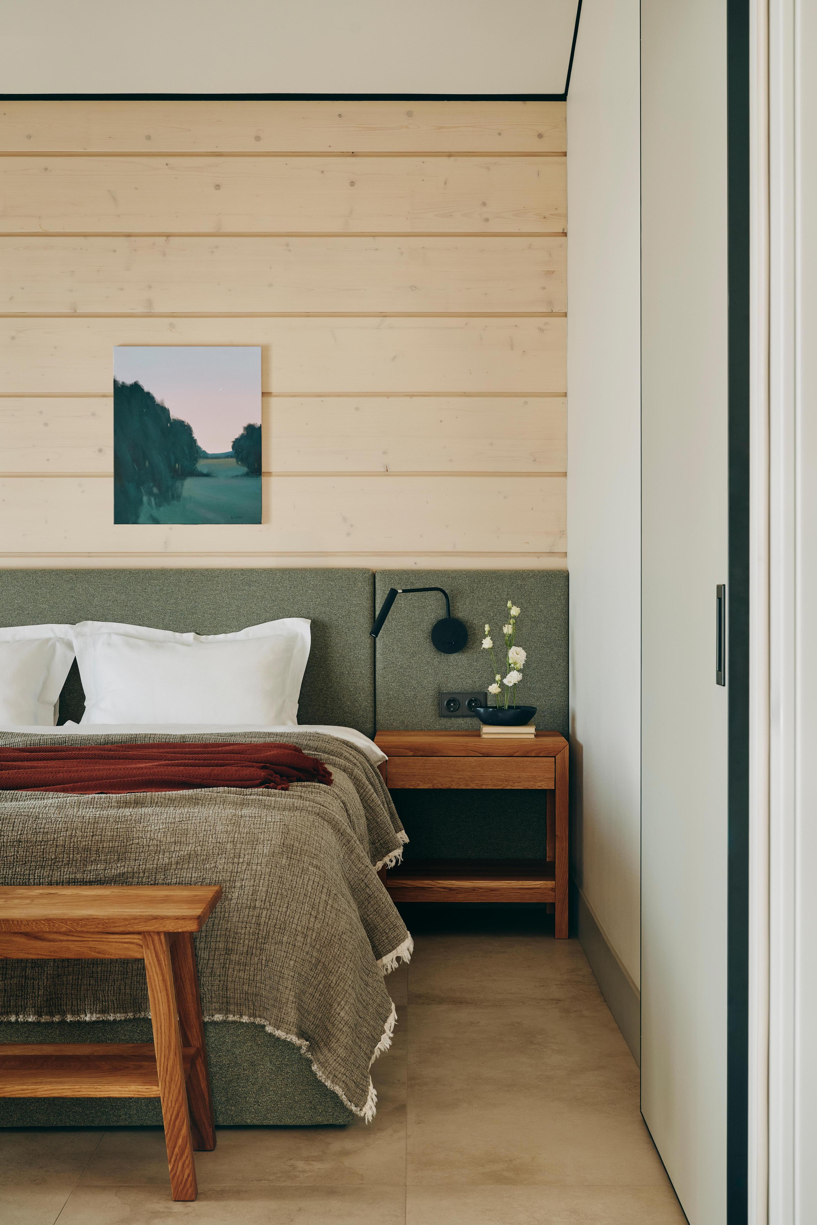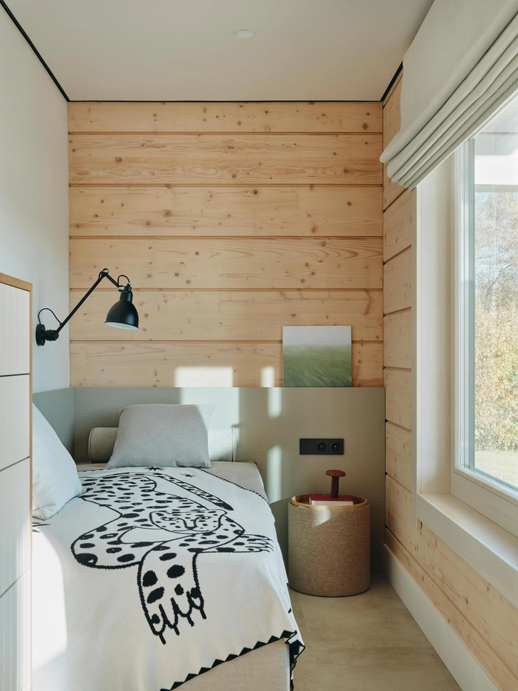 Одно из помещений изначально предназначалось для сауны, но для нее заказчики решили построить отдельный комплекс. Так что на этом месте появилась еще одна спальня, которой как раз не хватало. Небольшая, но уютная, со всем необходимым — прямо комната интроверта.