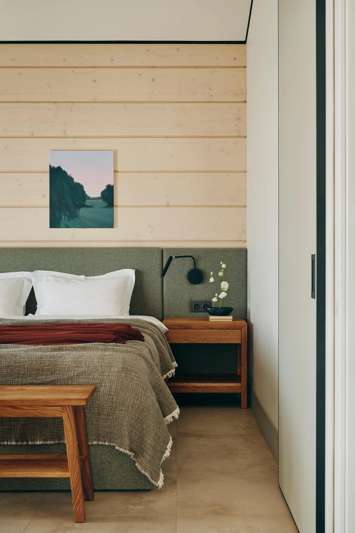 Особую роль в интерьере играет искусство Александры Савиной. Ее работы предлагают замедлиться, остановиться, подумать. Лаконичные сюжеты и минималистичные приемы идеально вписались в идею загородного дома, куда приезжают отдохнуть и восстановиться. Картины напоминают о ценности созерцания, о ценности момента. И, конечно, их безмятежность дополняет пейзажи за окном: водную гладь и изредка пробегающих вдалеке диких животных.