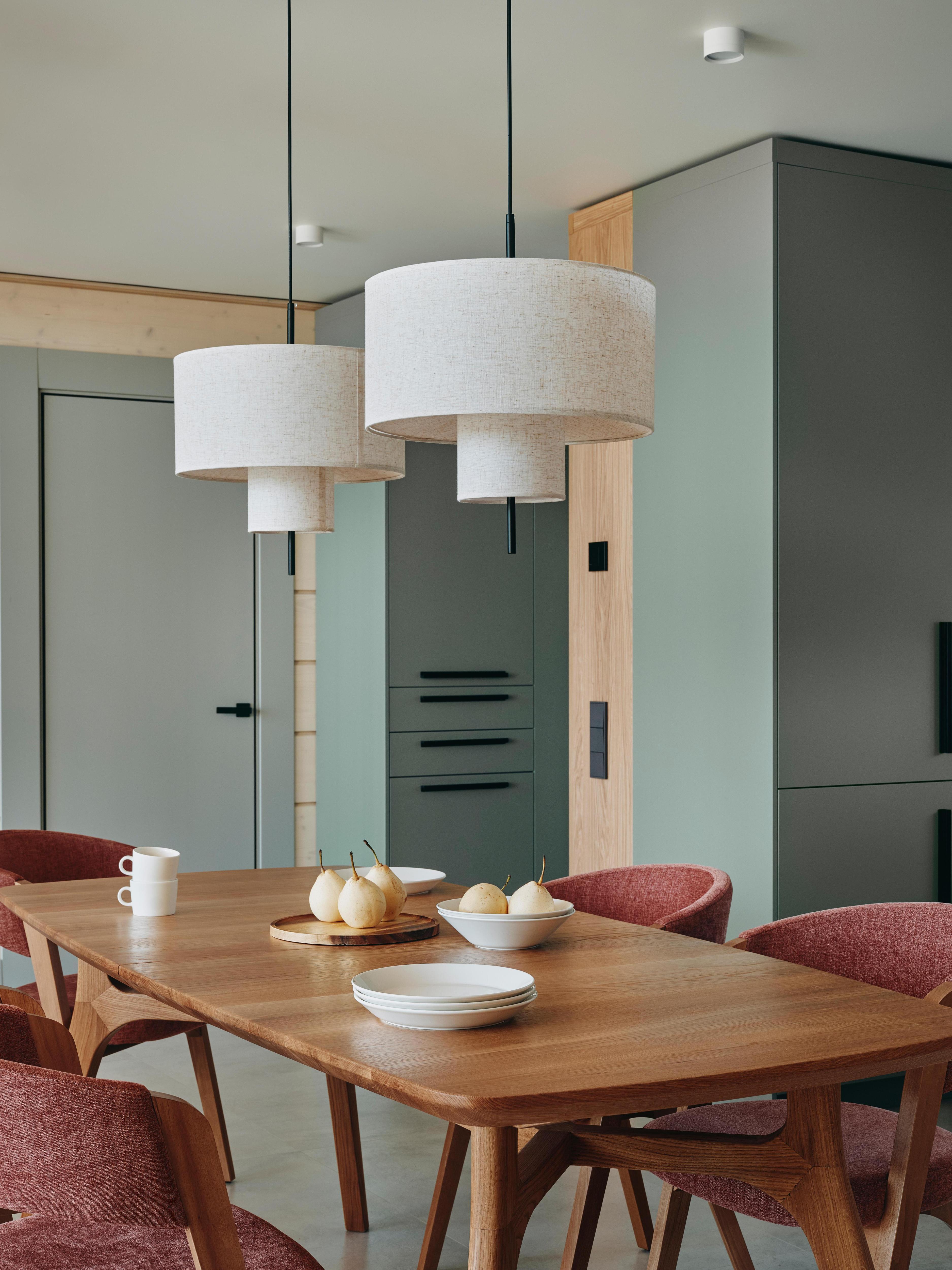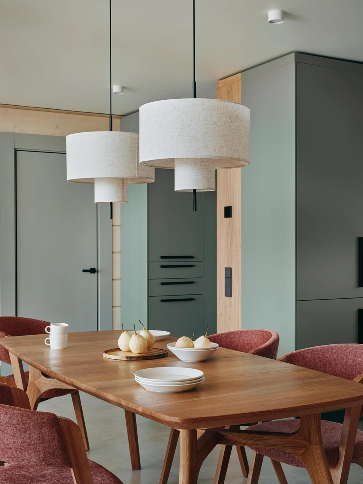 Первое, что мы заметили, когда впервые оказались на объекте — огромный валун, покрытый мхом, тогда участок еще не до конца разработали. Отчасти его цветовая палитра и стала отправной точкой, к тому же, клиент очень любит зеленый цвет. Он прекрасно сочетается с клееным брусом, из которого построен дом. Правда, древесный рисунок нам показался достаточно монотонным, и мы добавили контрастные ему гладкие окрашенные поверхности стен, потолков и высокие панели в ТВ-зоне. Это делает интерьер легче и современнее.