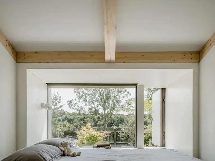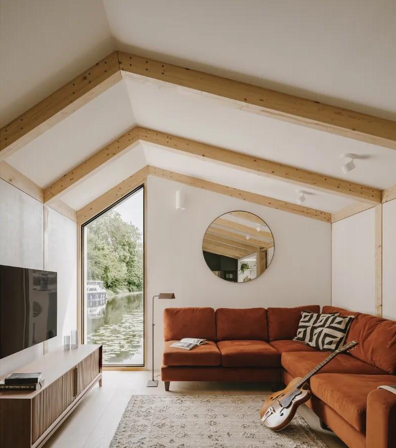 Главная идея была в том, чтобы поднять все жилые комнаты выше уровня воды. В обычных баржах пол часто находится ниже ватерлинии, из-за чего в помещении мало света и может быть ощущение, что ты в подвале. Здесь же благодаря высокому расположению и очень большим окнам получились светлые комнаты с красивым видом на канал. Изнутри создается ощущение простора и связи с природой.