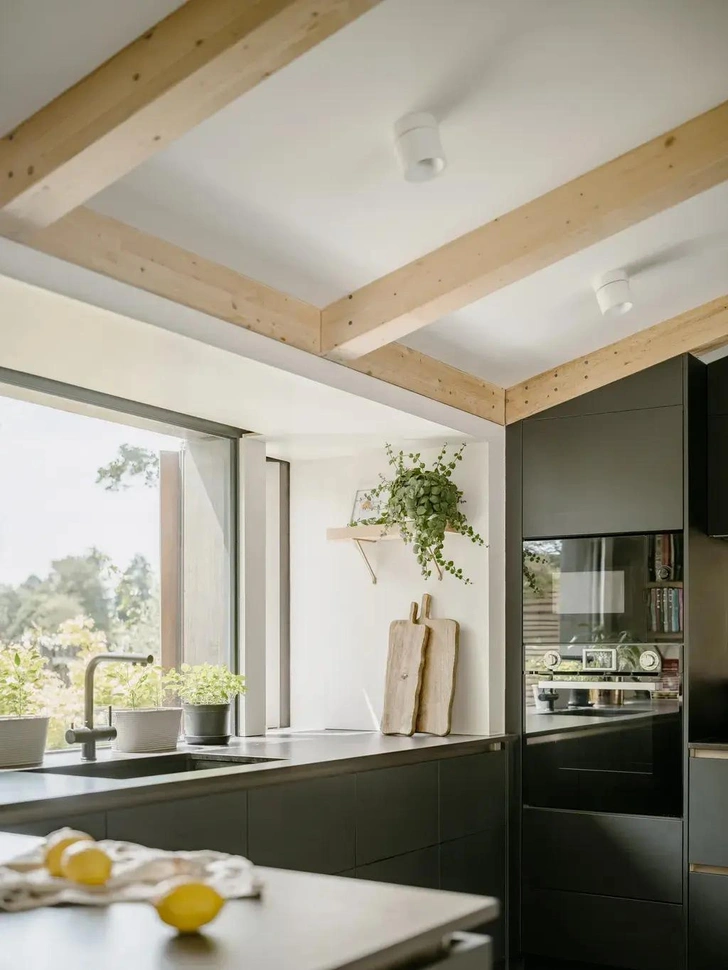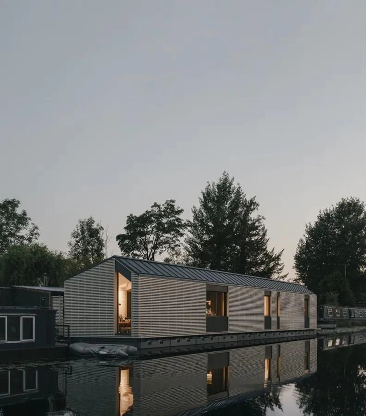 Снаружи дом обшит деревянными планками из специальной влагостойкой древесины Accoya. Со временем она потемнеет и дом будет выглядеть так, будто он всегда стоял у этого канала. Внутри виден деревянный каркас, что добавляет тепла и уюта. Полы сделаны из дуба, а кухня — черная, со столешницами из прочного искусственного камня. Архитекторы старались сделать дом легким и воздушным, чтобы он гармонировал с водой, отражал свет и казался частью пейзажа.