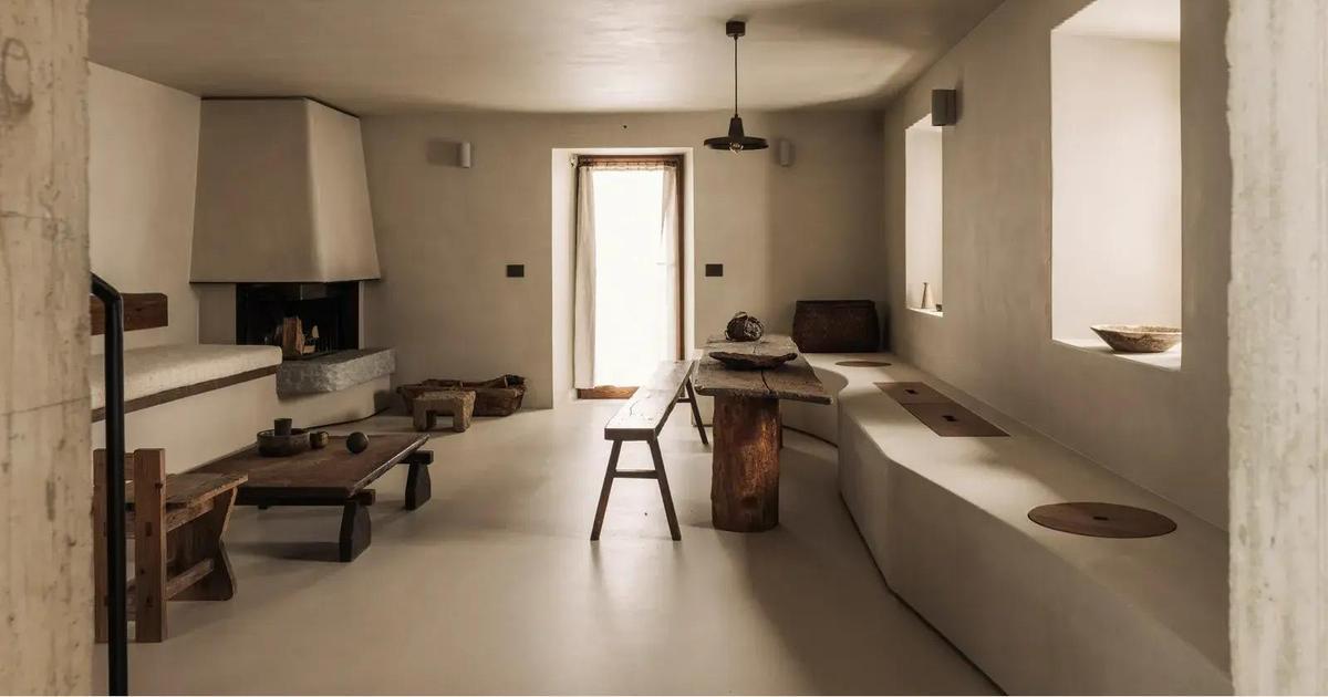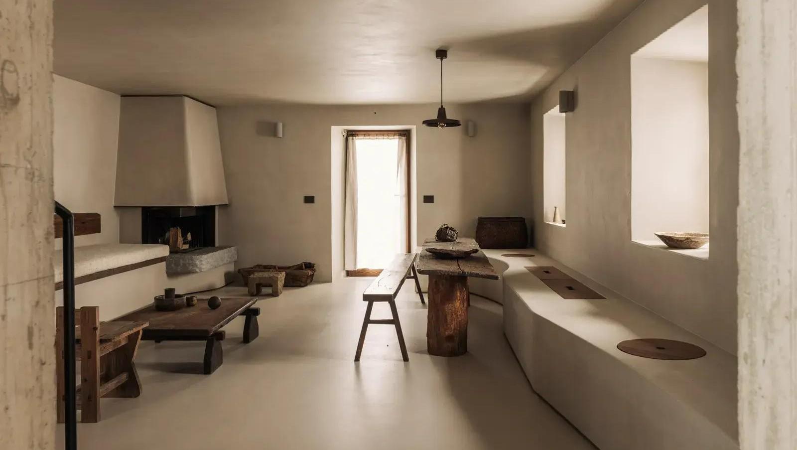 К ним добавляется третий, контрастный акцент — сырой, необработанный бетон в некоторых зонах, напоминающий о скальной породе самих Альп. Эта триада создает среду в эстетике ваби-саби, где ценятся следы времени, естественные неровности и подлинность материалов. Винтажная мебель, найденная у местных ремесленников, лишь усиливает это ощущение аутентичности и вневременности.