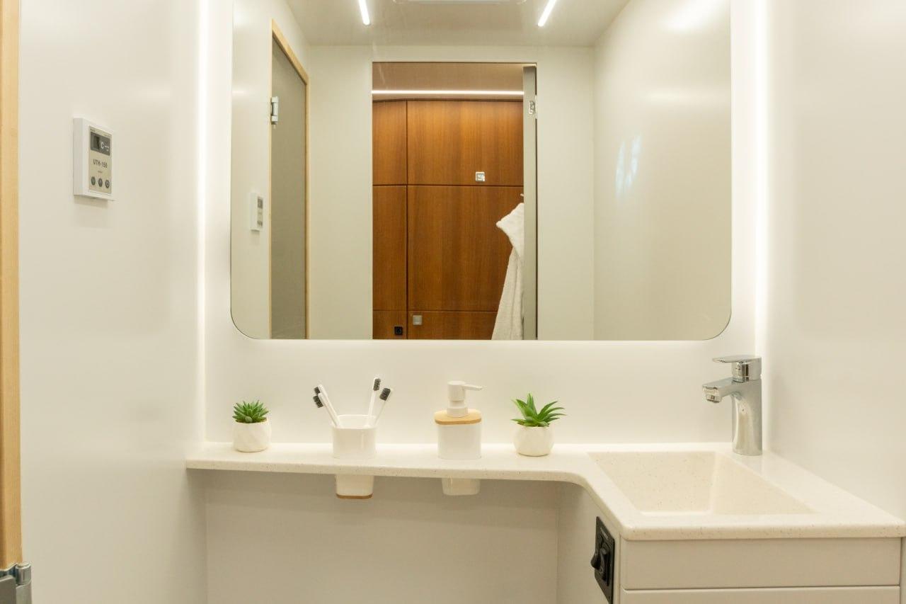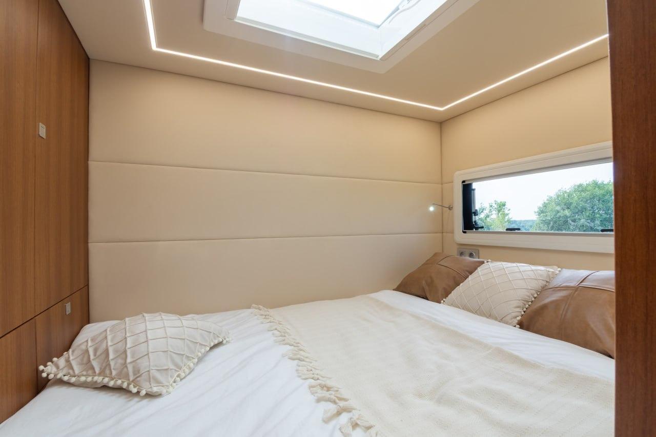 Брутальный внедорожник дополнен комфортным и современным интерьером — с многоуровневой системой освещения, гардеробной, посудомоечной и стиральной машинами, двуспальной кроватью и даже проектором.