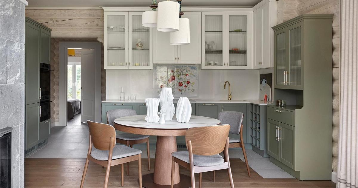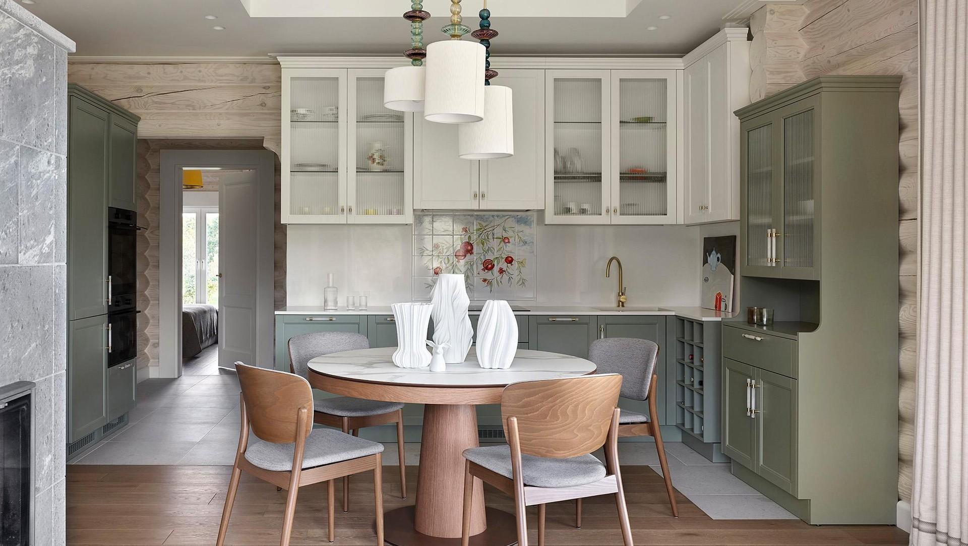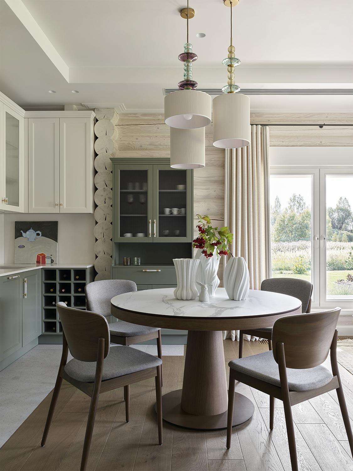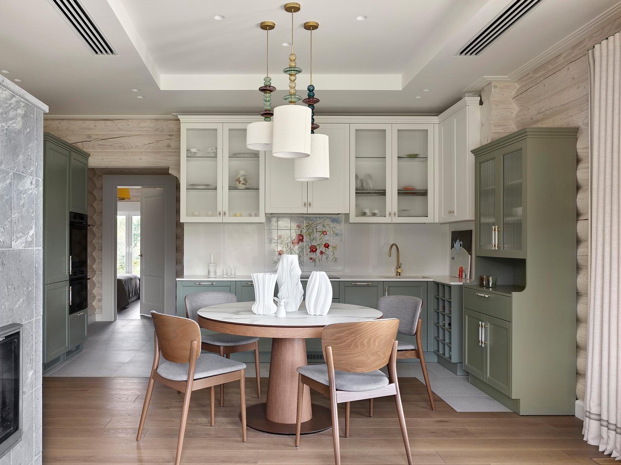 В кухне-гостиной получилось хорошее зонирование. В центре — большая кухонная зона приятного зеленого цвета с обеденным круглым столом и волшебными итальянскими светильниками из красочного муранского стекла. Небольшое керамическое панно на фартуке, выполненное художником Маргаритой Морозовой, добавляет яркий акцент. Релакс-зона — напротив печки, диван и кресло российской марки Unika Moblar в сочетании с «мраморным» столиком Bo-concept выглядят очень элегантно.