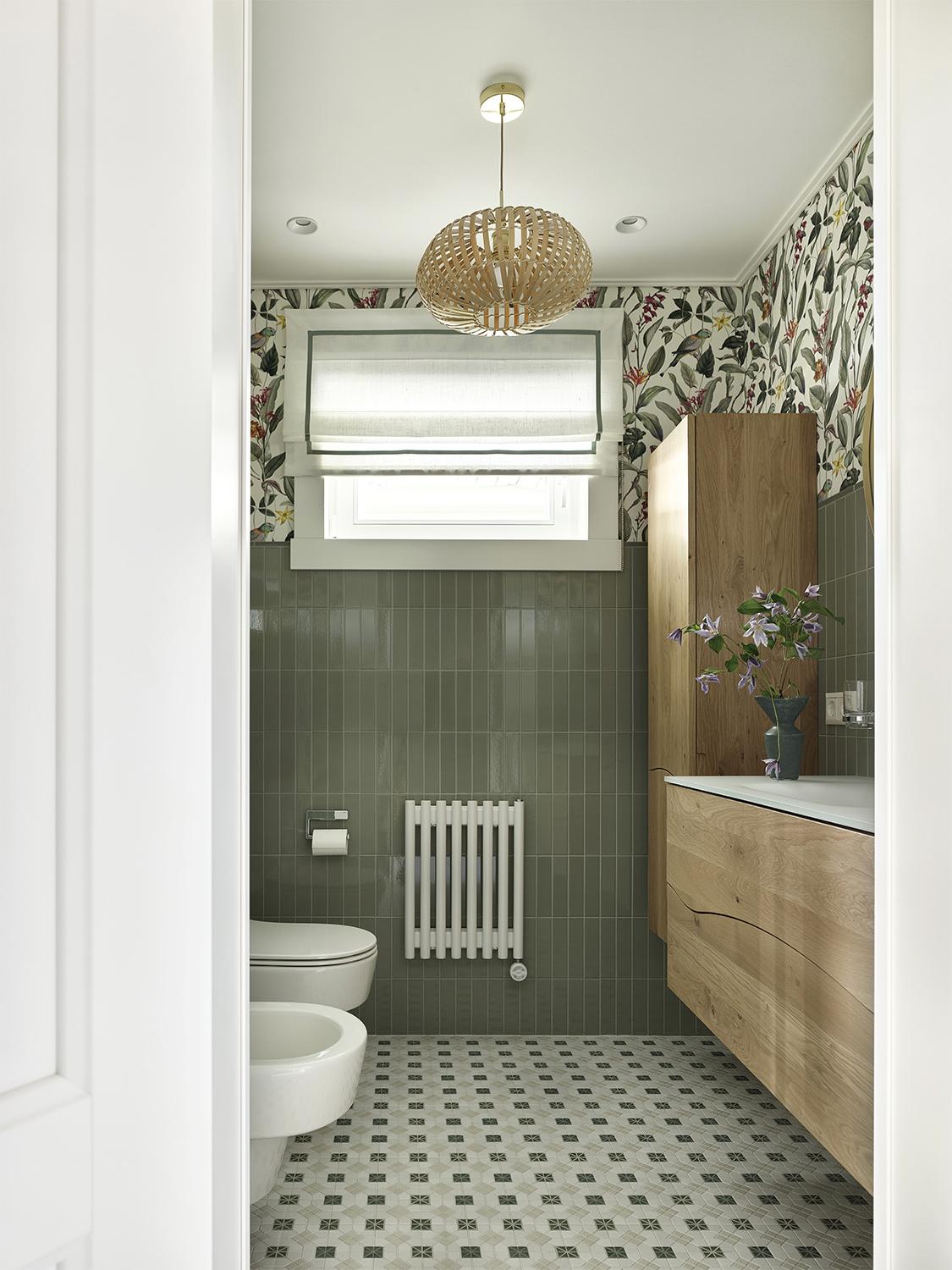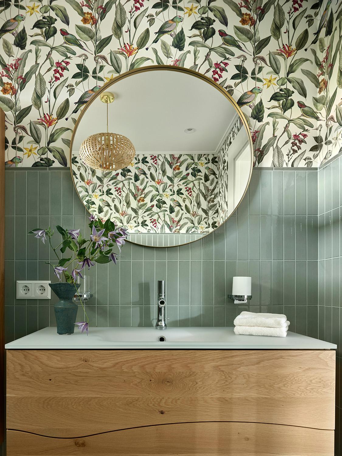 Большой санузел мы сделали немного фантазийным. Красочные цветочные обои с птицами в сочетании с зеленой плиткой и деревянной мебелью сделали это место похожим на жилую комнату — настолько здесь уютно.