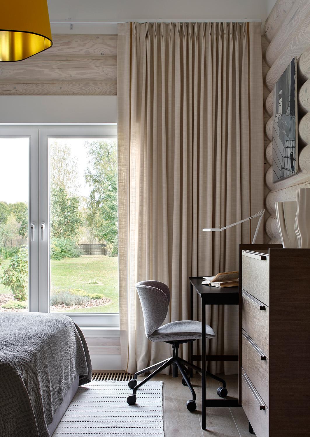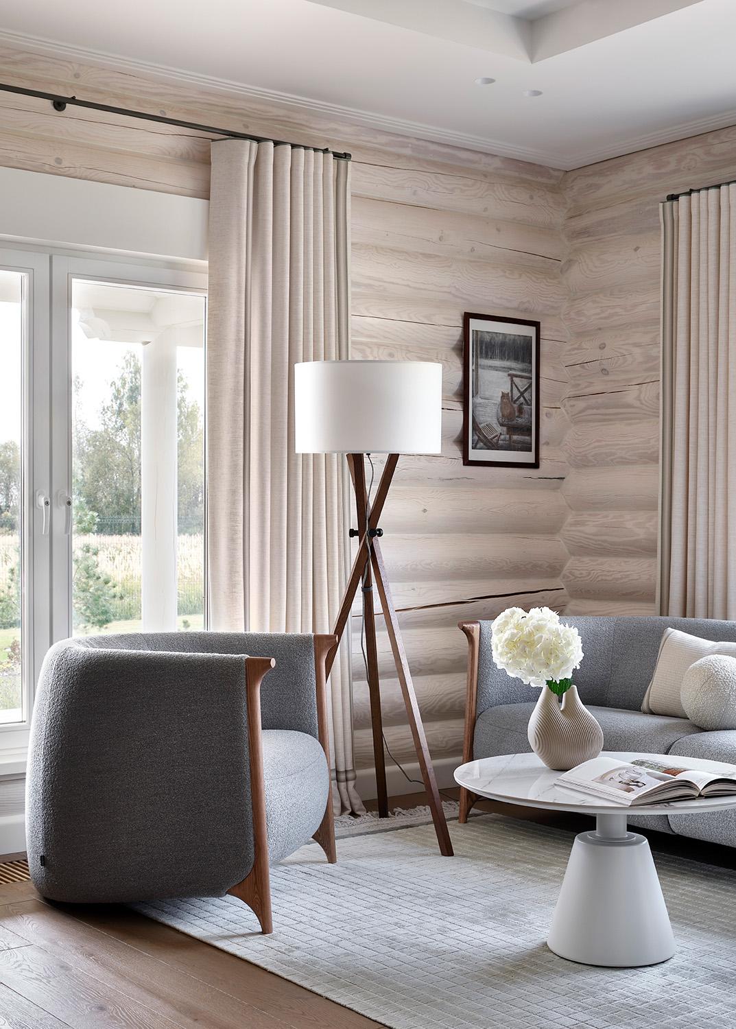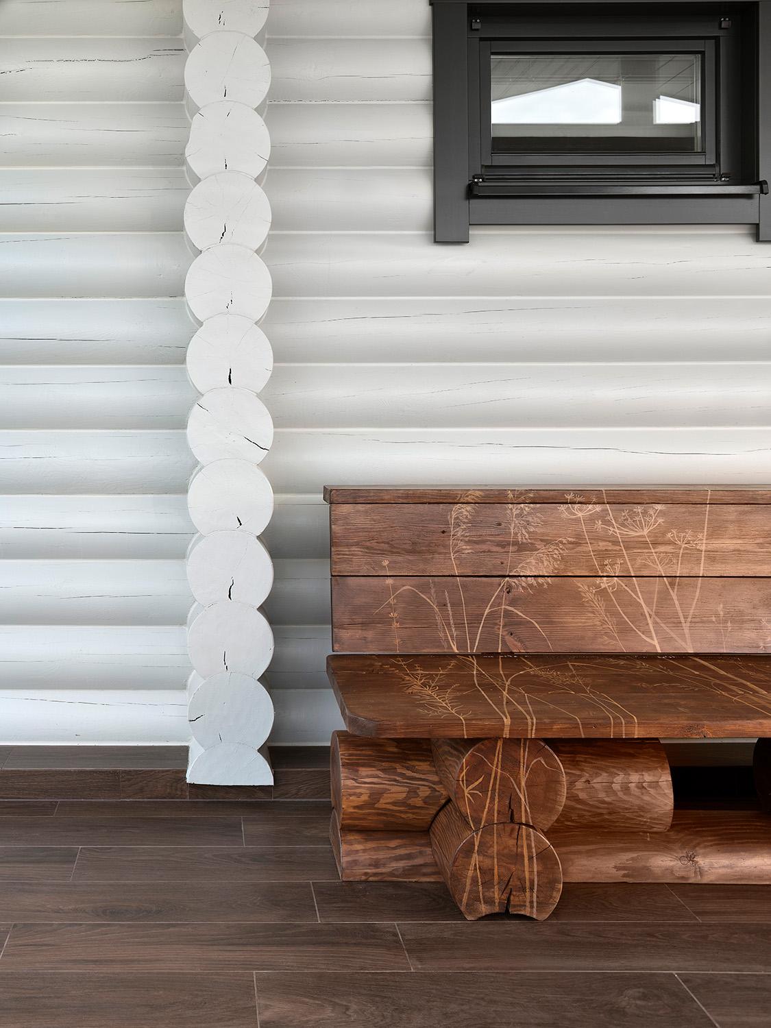 Пространство получилось очень светлым, с небольшими и редкими яркими вкраплениями. Стены покрыты маслом с твердым белым воском, что сохраняет деревянную текстуру бревен.