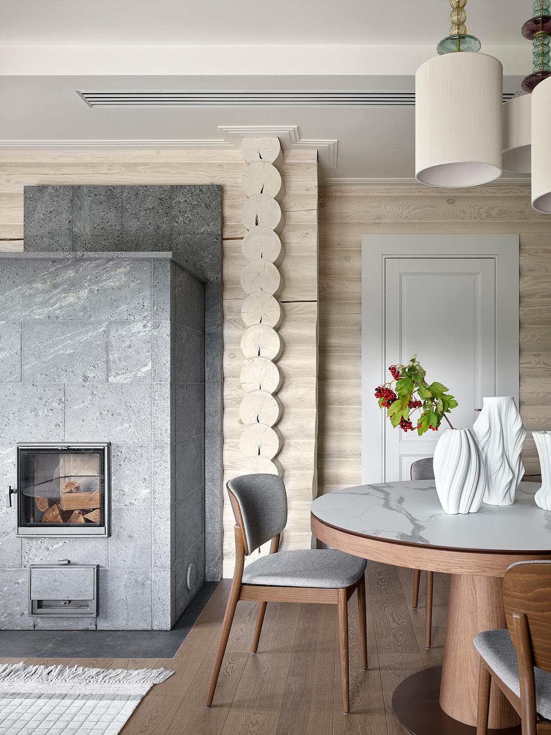 Самый необычный, интересный предмет в этом доме — финская печь из камня туликиви. Серая и неброская, но фактурная, она придает пространству особый уют, делает его живым.