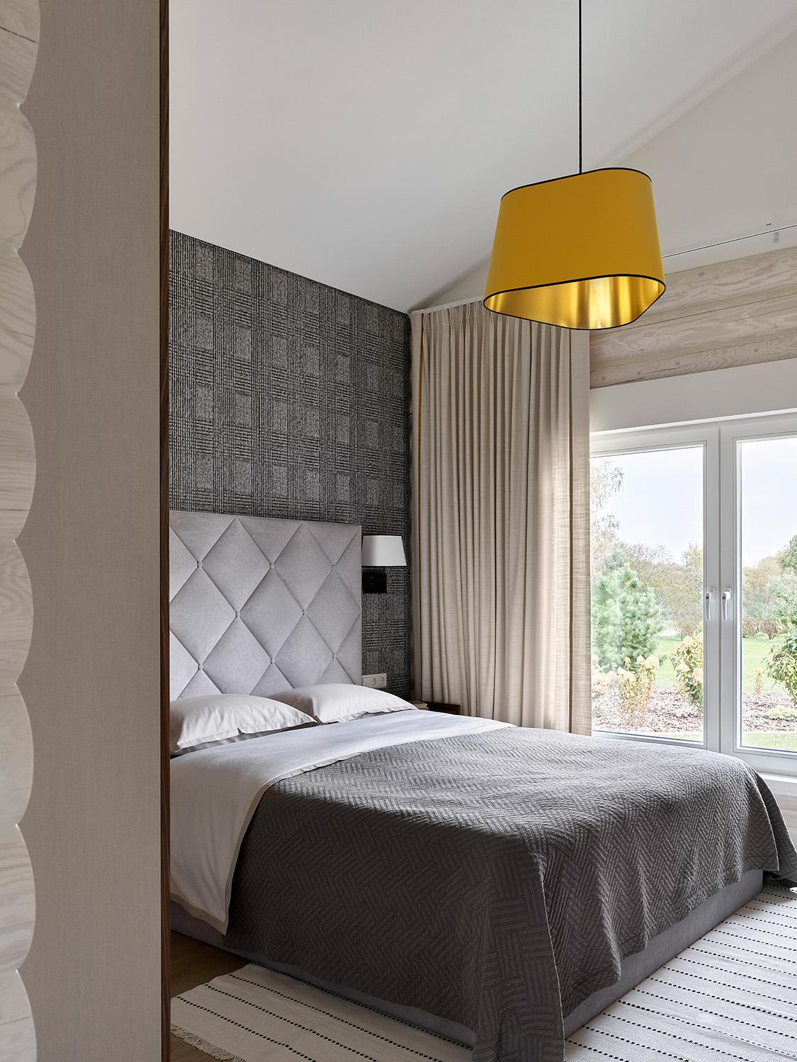 Кровать, Vitset. Постельное белье и покрывало, AtelierTati. Бра и светильник над кроватью, Designheure. Шторы и циновка, студия «Доброе Утро».