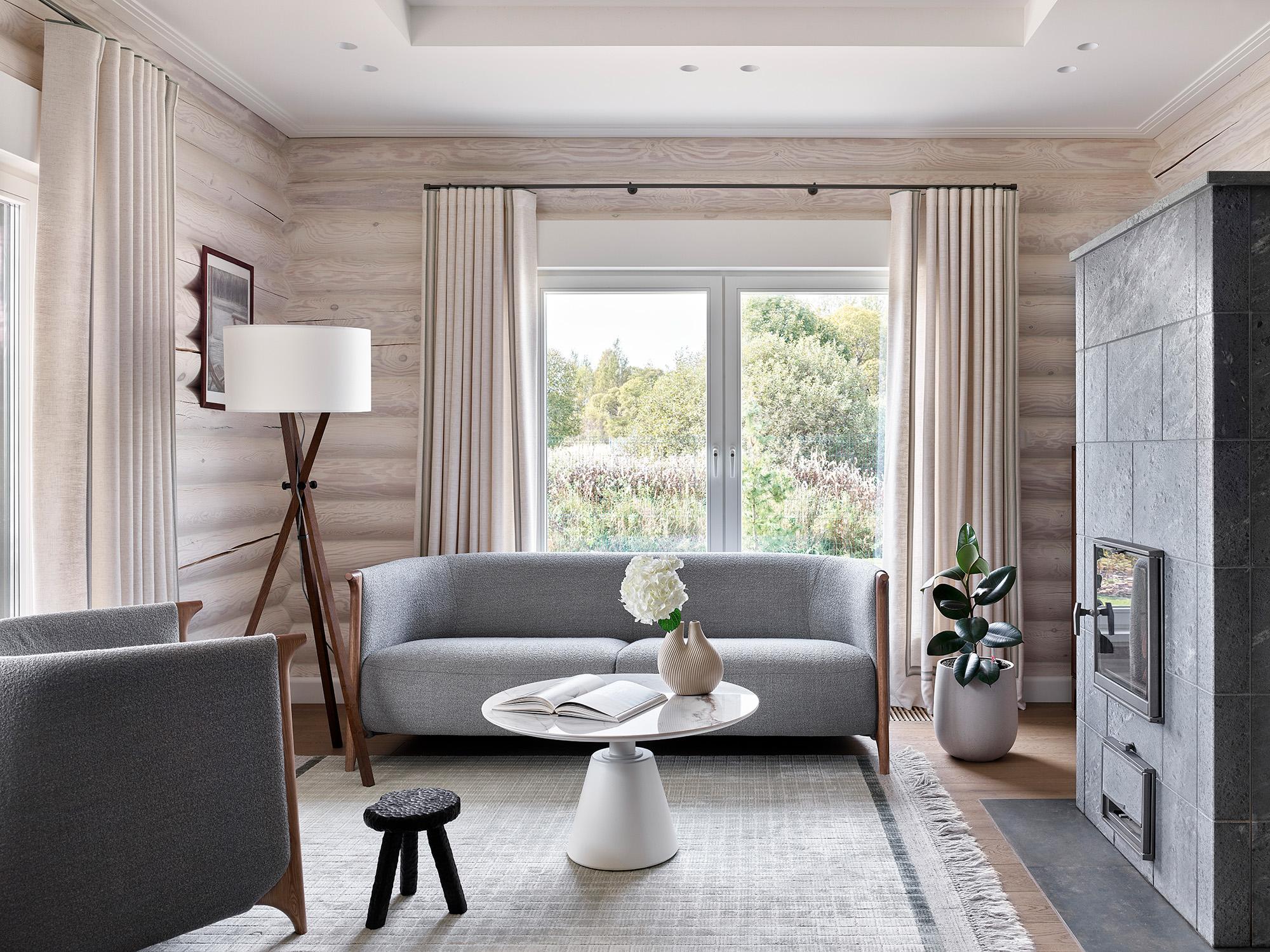 Диван и кресло, Unika Moblar. Журнальный столик, Bo Concept. Торшер, Aromas del Campo. Ваза, Hay, Gk concept. Шторы, студия «Доброе Утро». Ковер, Art de Vivre. Печь, Tulikivi. Табурет, Modenature.