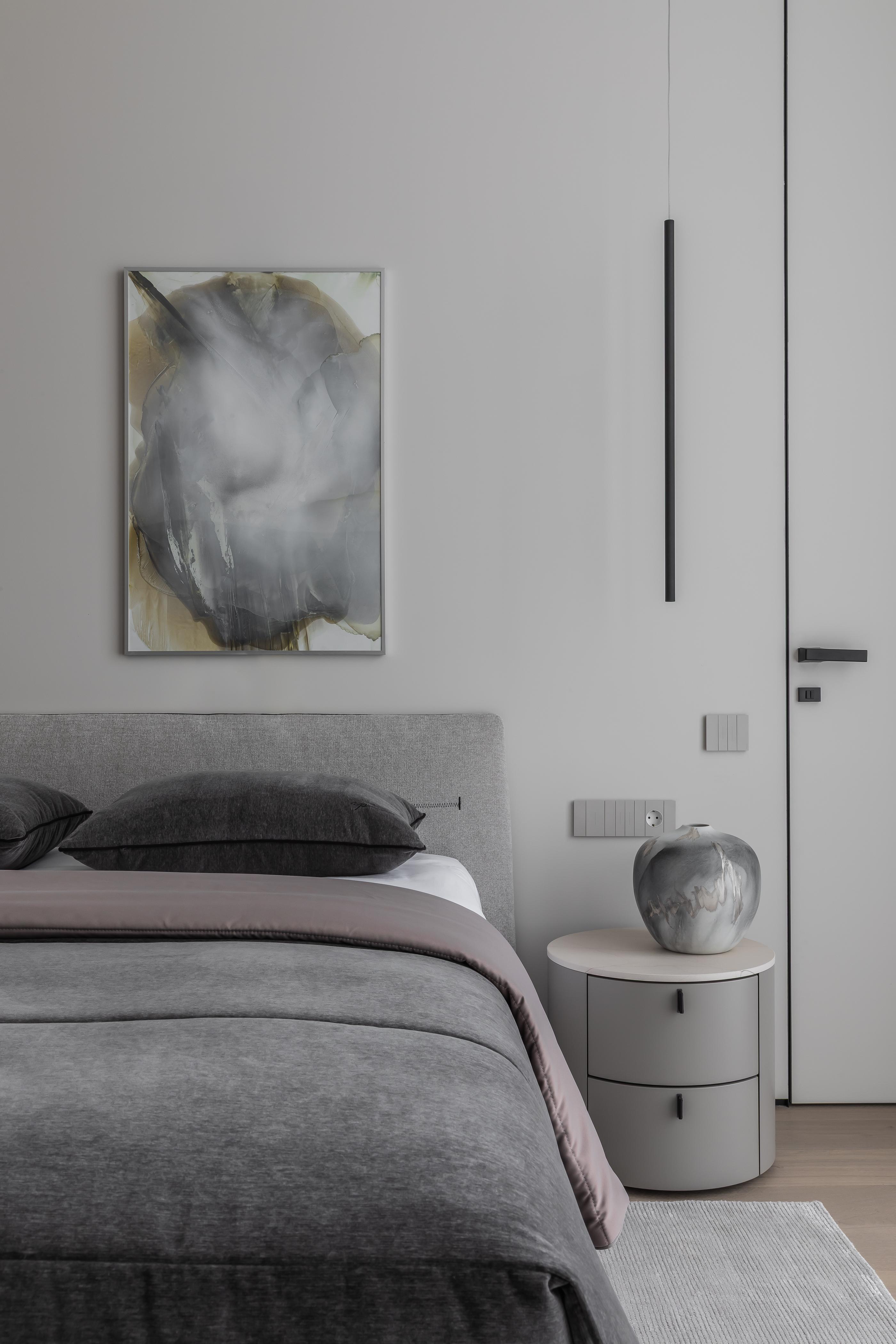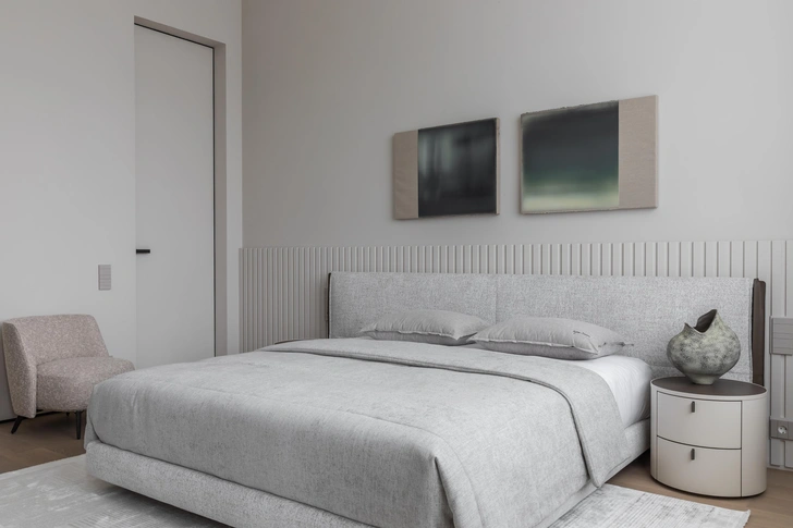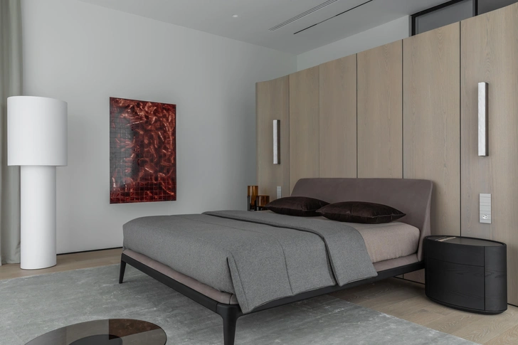 Шпонированная перегородка с радиусными элементами изготовлена по эскизам дизайнера на столярном производстве. Кровать и прикроватные тумбы, Poliform. Торшер Pipe, Lodes. Бра у кровати Artes Wall, Cto Lighting. Исскуство, Александр Рощин. Инженерная доска, Coswik. Плед и подушки, Potemkina design.