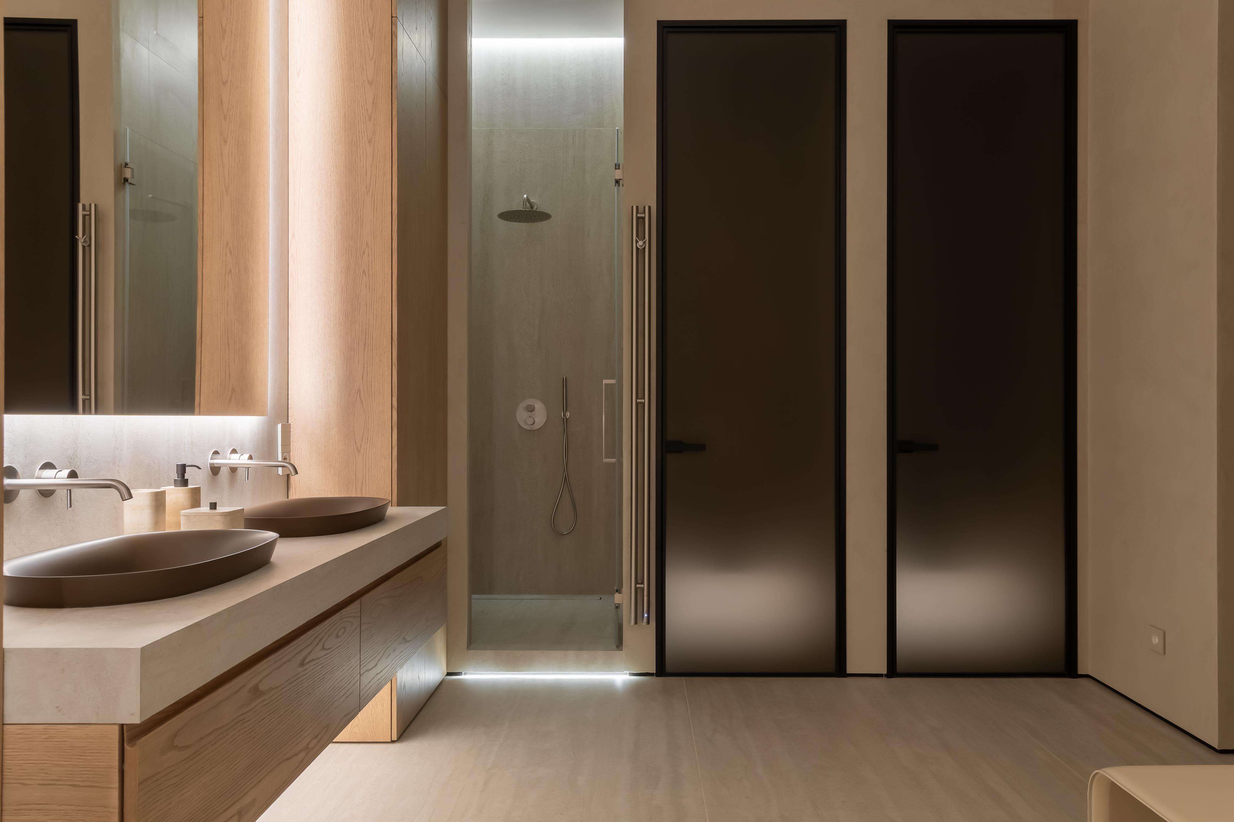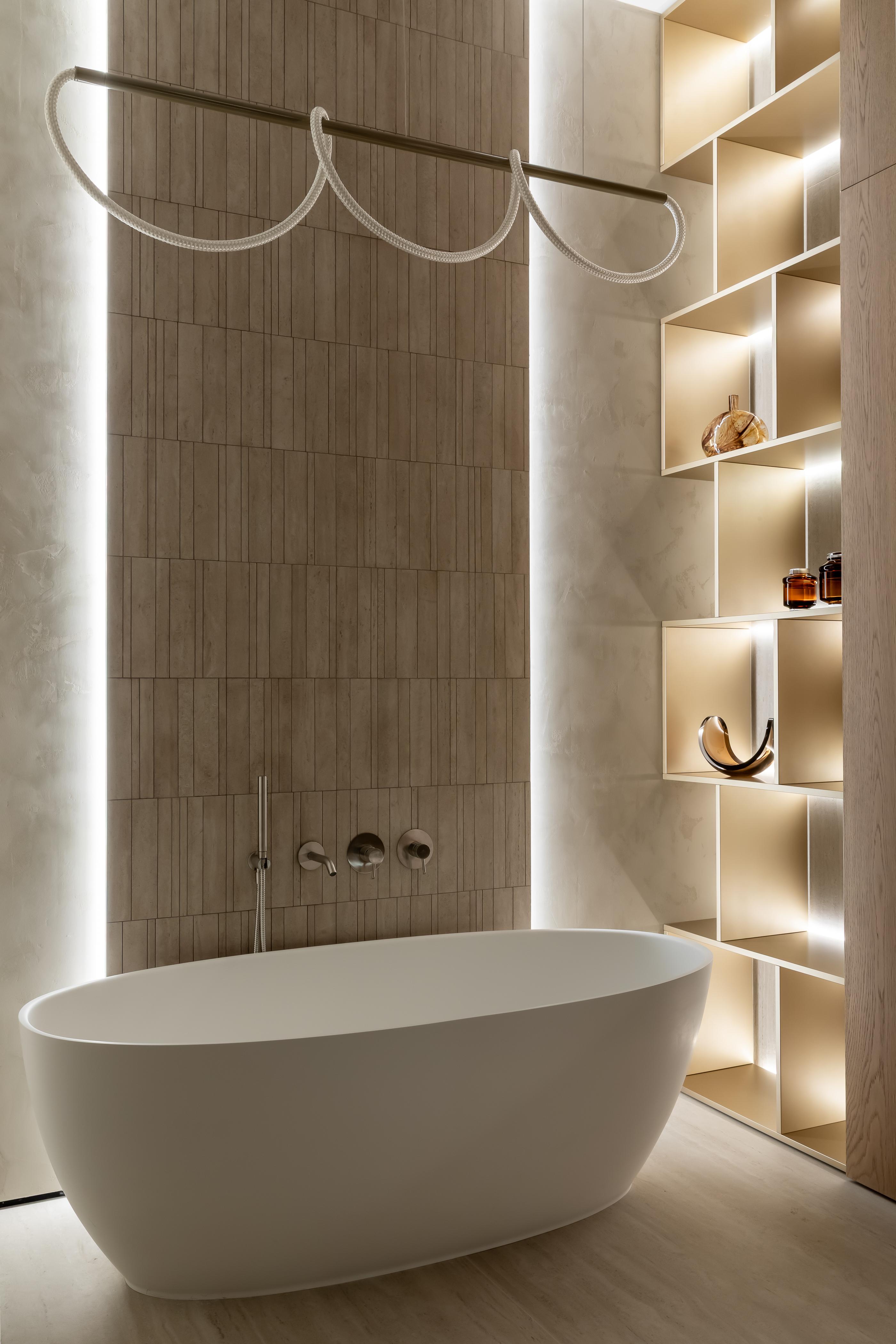 Ванна, Salini. Смесители, Noken. Керамогранит на полу и на стенах Ttravertino, Mirage. Декоративная штукатурка, Venicolor. Мебель для ванной комнаты изготовлена по эскизам дизайнера на столярном производстве.