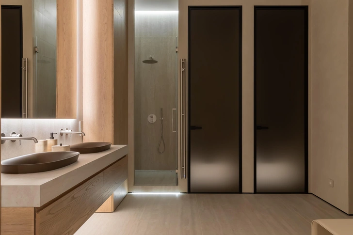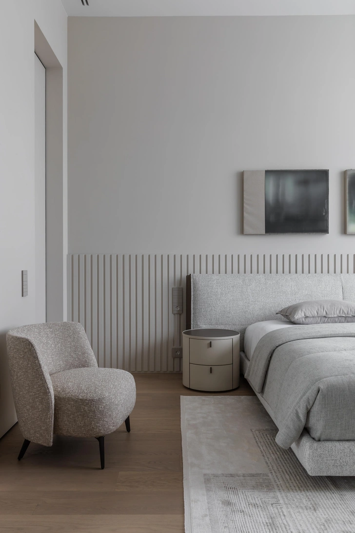 Ощущение безмятежности мы создали с помощью спокойной палитры и натуральных материалов, пространство получилось тактильным и живым: бежевые и серые оттенки, дерево, мрамор, нежный текстиль…