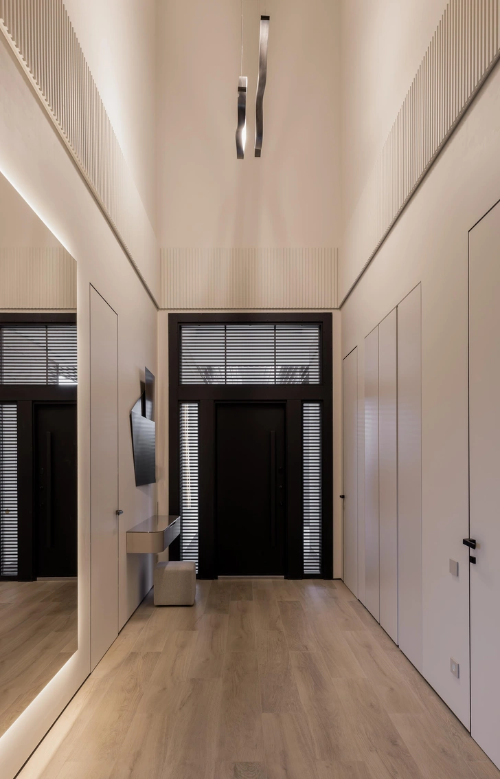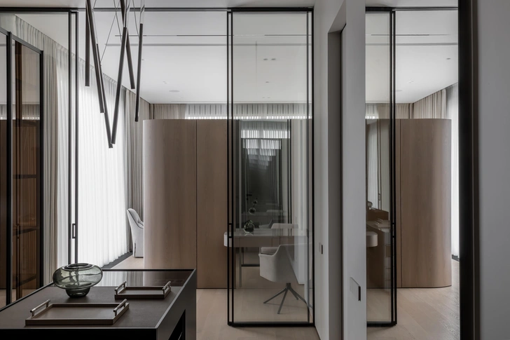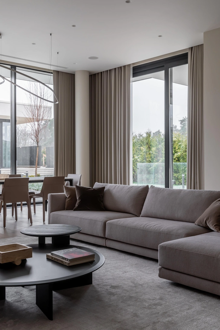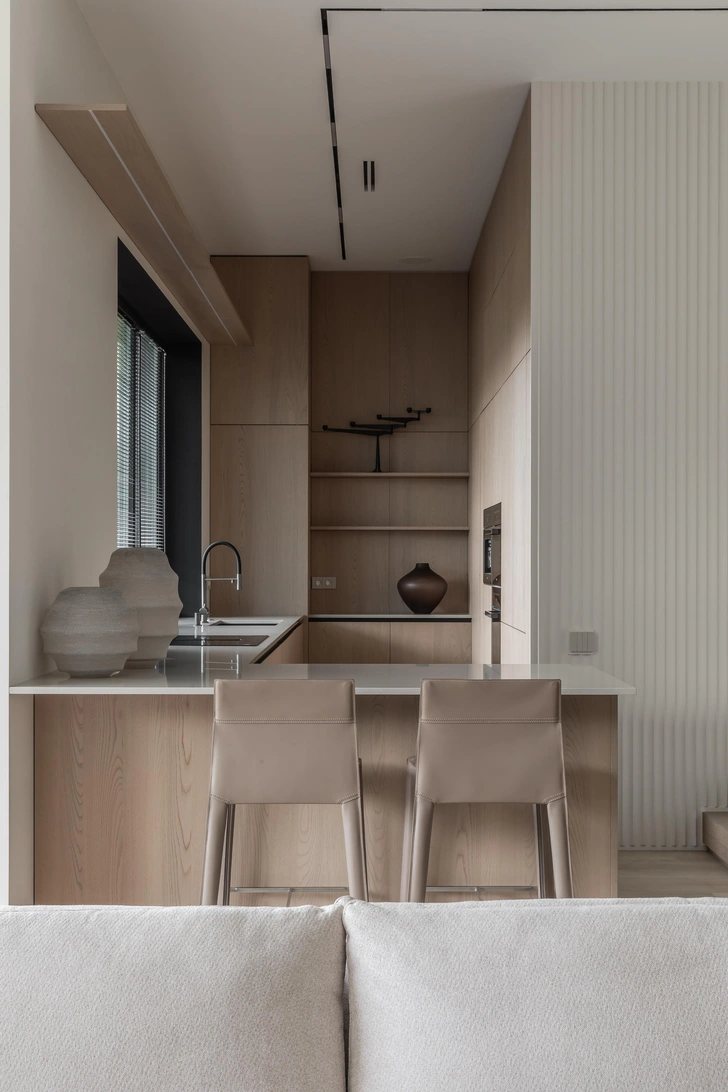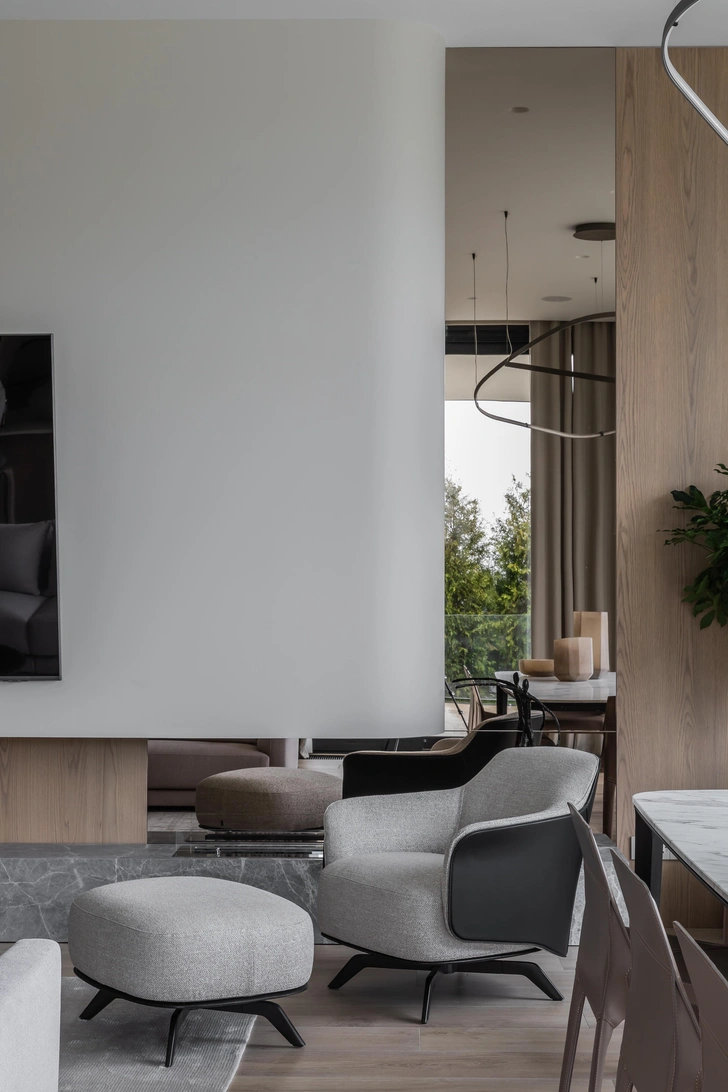 Заказчик — человек активный, любит путешествовать, у него большая насмотренность. Он попросил нас создать светлый и воздушный интерьер, в котором будет чувствоваться единение с природой за окном. Он не должен удивлять: главное — атмосфера тихой роскоши, где материалы, текстуры, качественная мебель и детали говорят сами за себя.