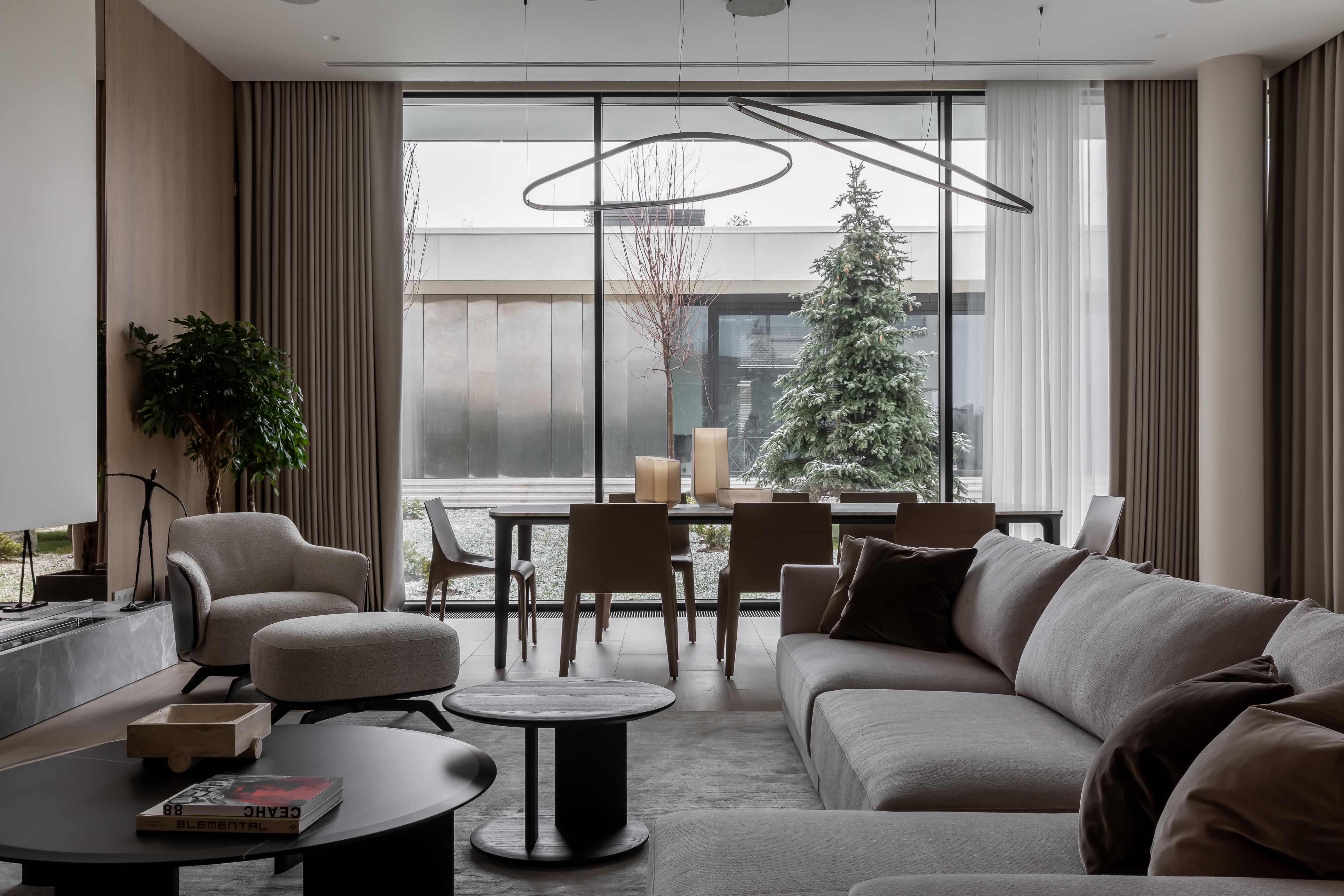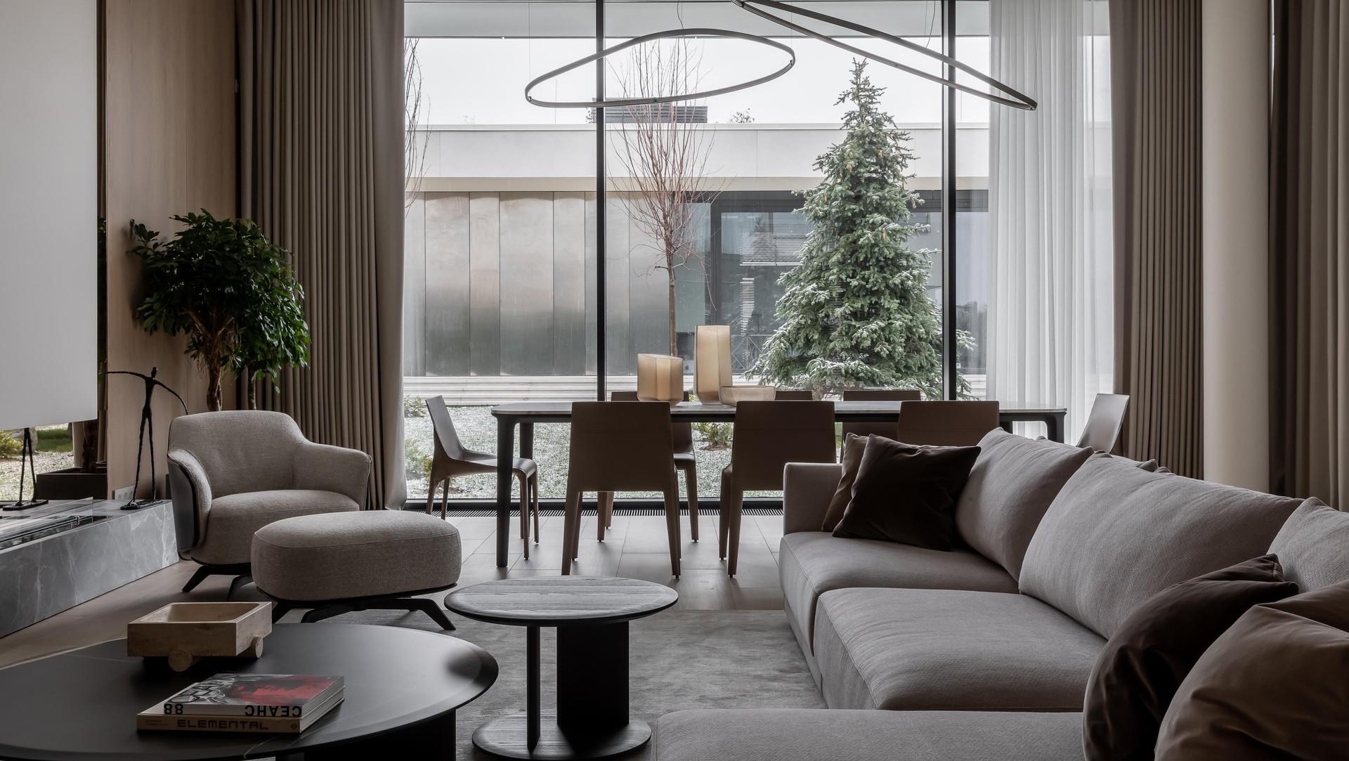 Здесь открываются прекрасные виды на двор. Чтобы создать эффект полного погружения в тихий пейзаж, мы установили зеркальные панели напротив окна. Но особенно уютно в гостиной к вечеру, в это время можно выбрать разные световые сценарии и создать нужную атмосферу для отдыха.