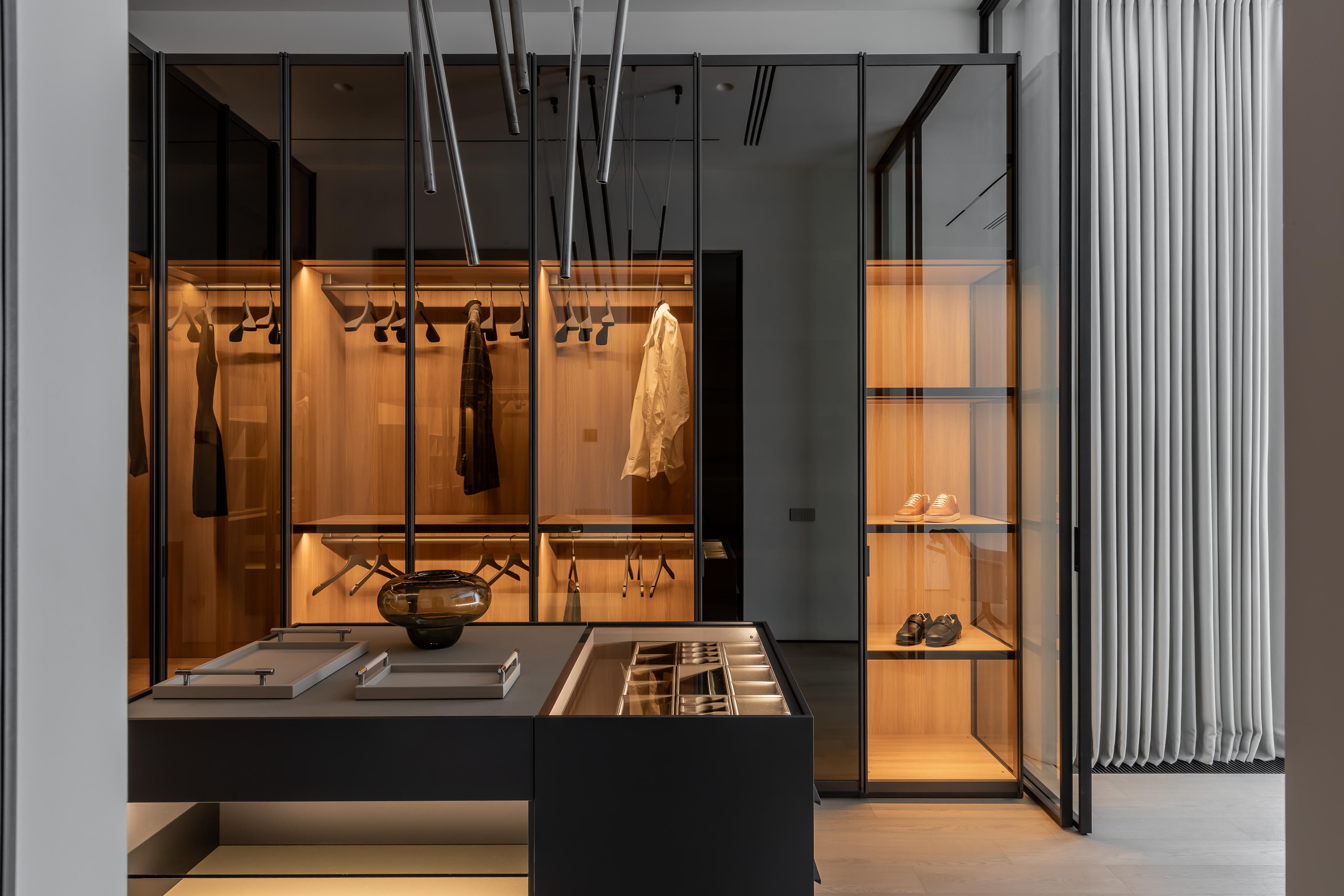 Гардеробная система, Poliform. Декоративное освещение над островом, Henge.