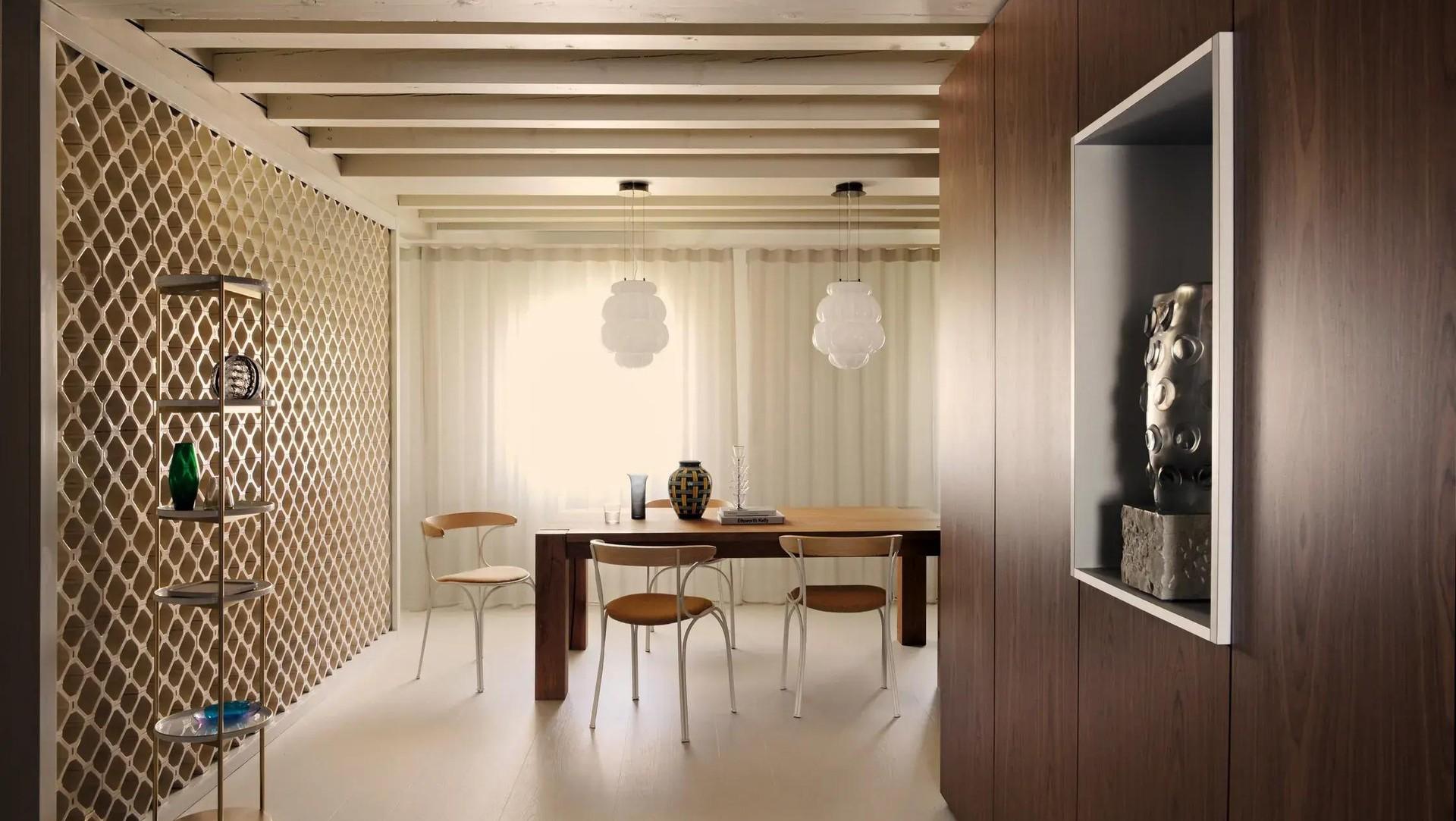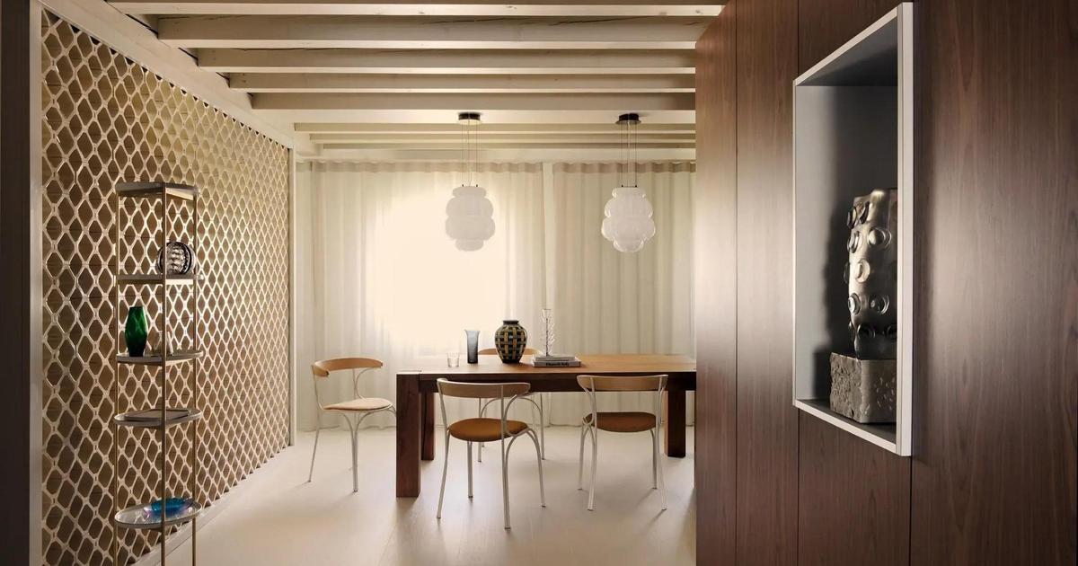 Ажурная перегородка из глазурованной терракоты, Ceipo. Книжный шкаф La Tour, Ginori 1735. Подвесные лампы Vallonnè, Barovier&Toso (все предметы спроектированы Лукой Никетто). Стол Bigfoot, дизайн Филиппа Майнцера для e15. Стулья Ample, дизайн Луки Никетто для Gebrüder Thonet Vienna. На столе — ваза Carafe по дизайну Луки Никетто для Smaller Objects, ваза Stuoia Джо Понти для Ginori 1735. В нише — ваза из переливающегося стекла Nassa Луки Никетто для Mjölk.