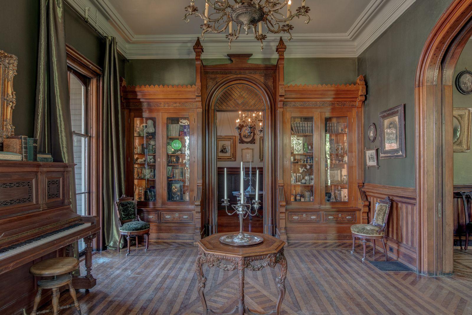 Площадь викторианского особняка составляет 557 квадратных метров, без учета гостевого дома. Массивные люстры, мебель в стиле королевы Анны и большие позолоченные рамы, обрамляющие старинные портреты, встречаются на всех фотографиях интерьера — подчеркивая величие дома или его жутковатость, в зависимости от того, насколько зритель знаком с сюжетом сериала.