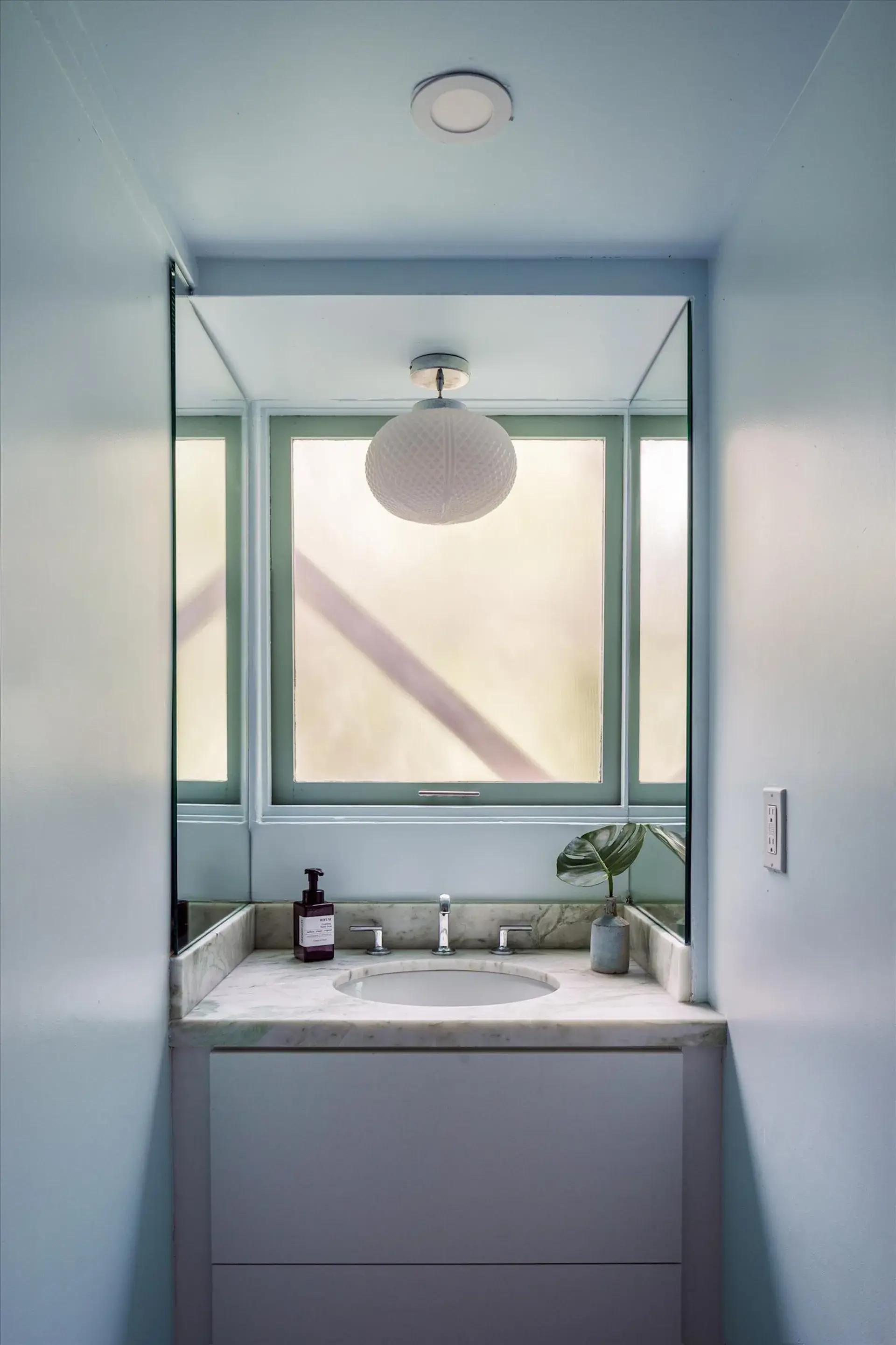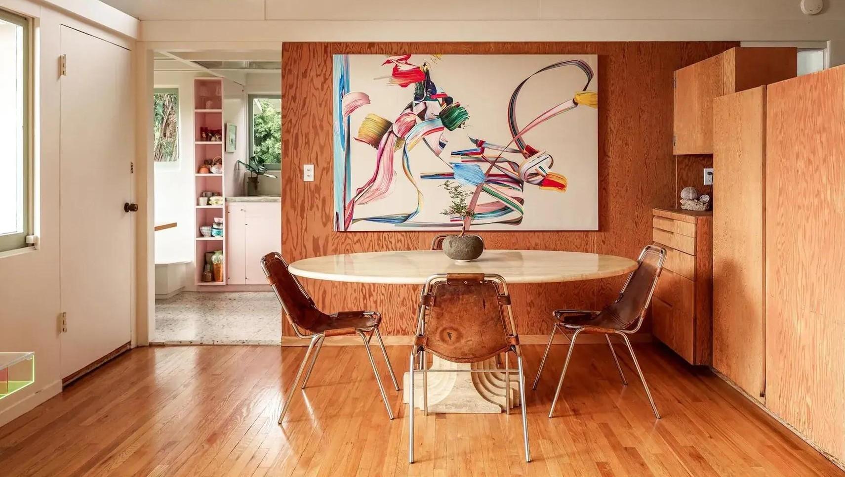 За гостиной находится небольшая вытянутая кухня. Нежности ей придают бледно-розовые фасады шкафов и яркие картины. Но самое прекрасное здесь — маленький столик у окна, такой уютный уголок для утреннего кофе с прекрасными видами. На нижнем этаже находятся спальни. Все так же — лаконичный дизайн, много воздуха и света, а главное — камерная атмосфера. Здесь сохранились оригинальные встроенные шкафы и светильники.