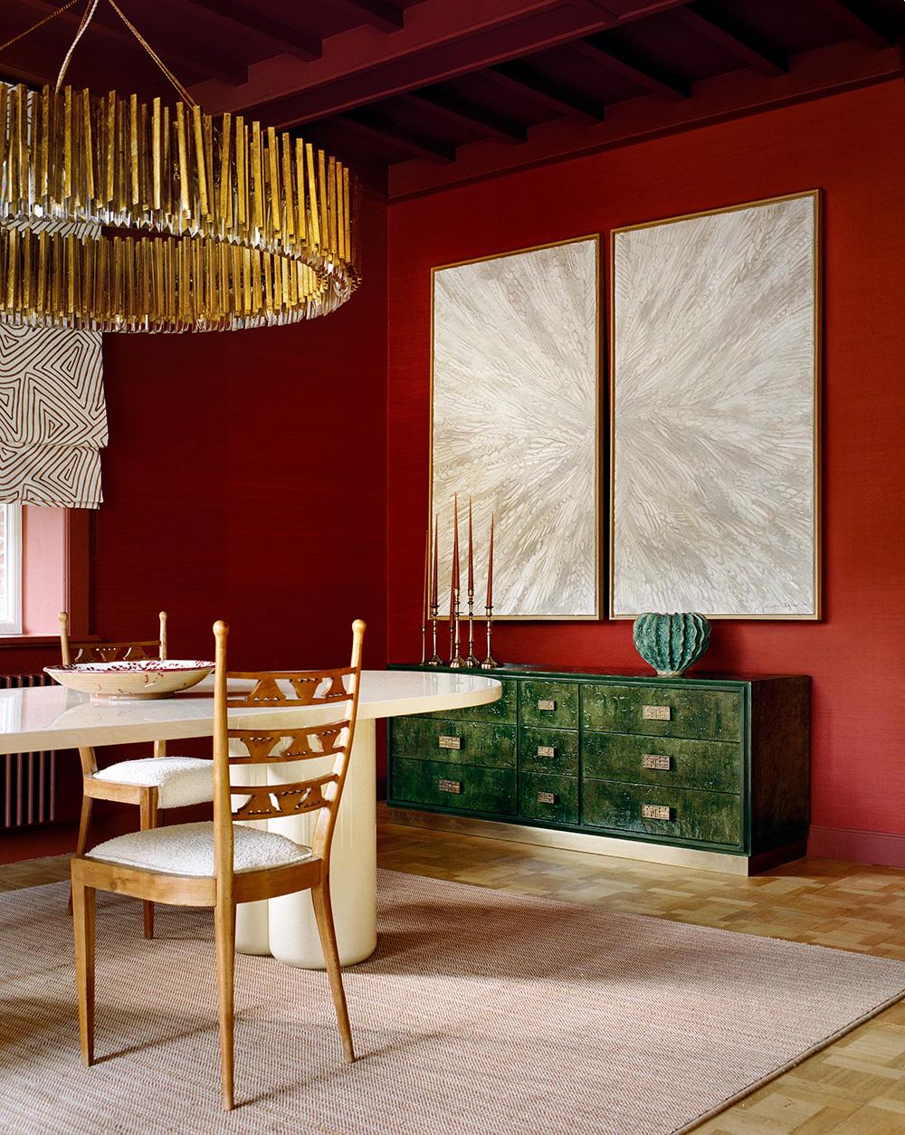Обеденный стол Clеmence по дизайну Виктории-Марии Гейер. Винтажные итальянские стулья 1940-х годов. Красные шелковые обои Shiva Roussillon, Pierre Frey. Потолок покрашен в оттенок Le Bien Aimе, Ressources. Подвесной светильник с позолоченными листьями и стеклом, Labyrinthe. Шторы Tonga Santal, Pierre Frey. Ковер Millepoints, Lopez.
