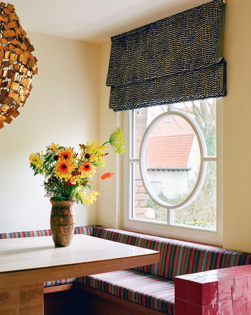 Штора из ткани Dora а горошек, Boussac. Ваза, Asiatides.Подушка скамьи обтянута тканью Canyon, Pierre Frey.