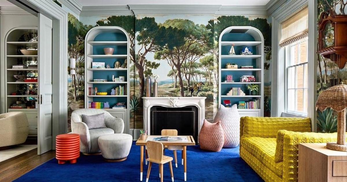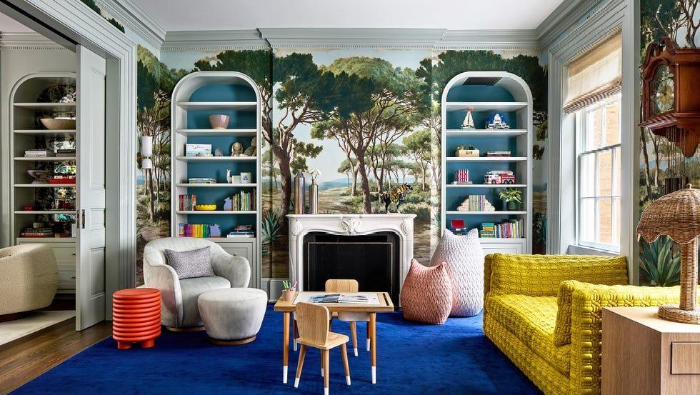 На месте столовой сделали игровую комнату. На стене обои с изображением леса, Pierre Frey.