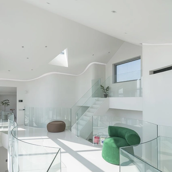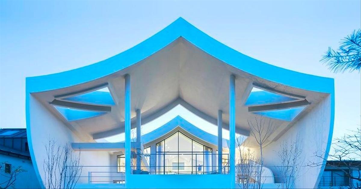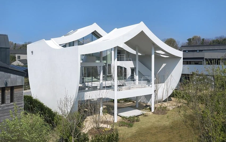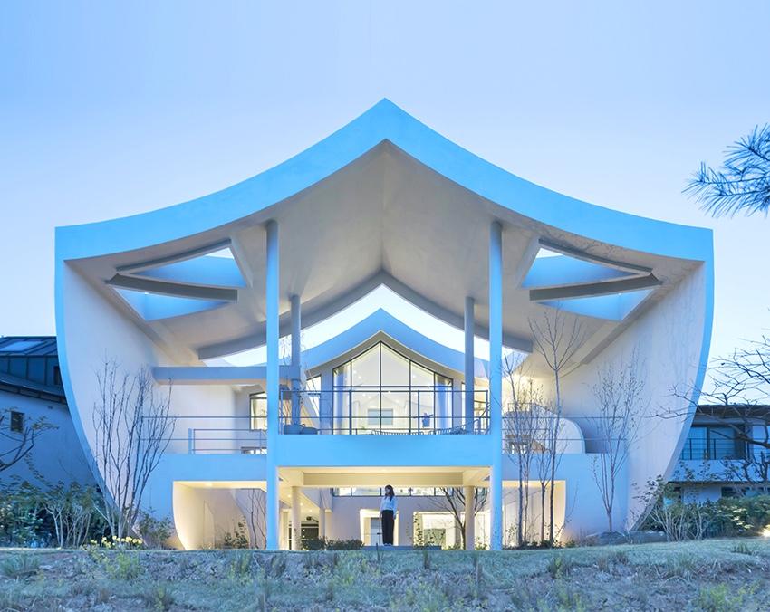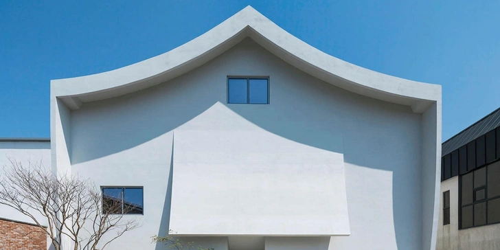 Упрощенная, изогнутая крыша с А-образным карнизом отсылает к ощущению восходящего движения, характерному для традиционной корейской архитектуры. Форма крыши подчеркивает культурную преемственность дома.