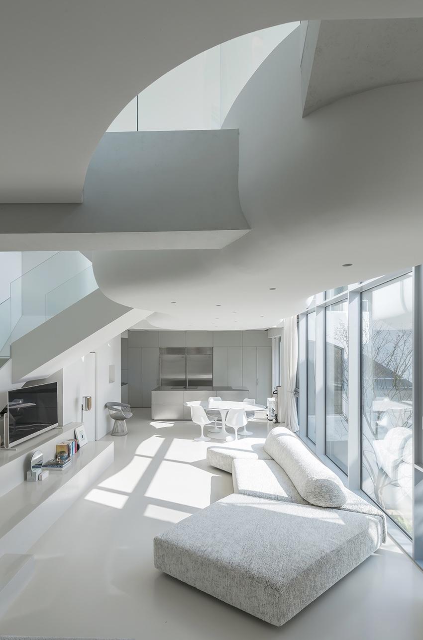 Iroje KHM Architects назвали проект Ho-Un, что означает «облако над озером», и это отражено в пространственной планировке интерьера. Спальня расположена над гостиной и выполнена в виде облака, создавая вертикальную пространственную связь между общими зонами и подчеркивая то, что объект расположен на берегу озера.