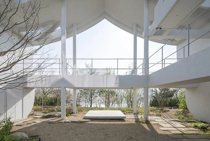 Основная архитектурный элемент дома — «Врата жизни», проем, который связывает внутреннее и внешнее пространство. Выполняя одновременно функцию границы, ширмы и декоративного элемента, врата обрамляют виды на озеро и город.