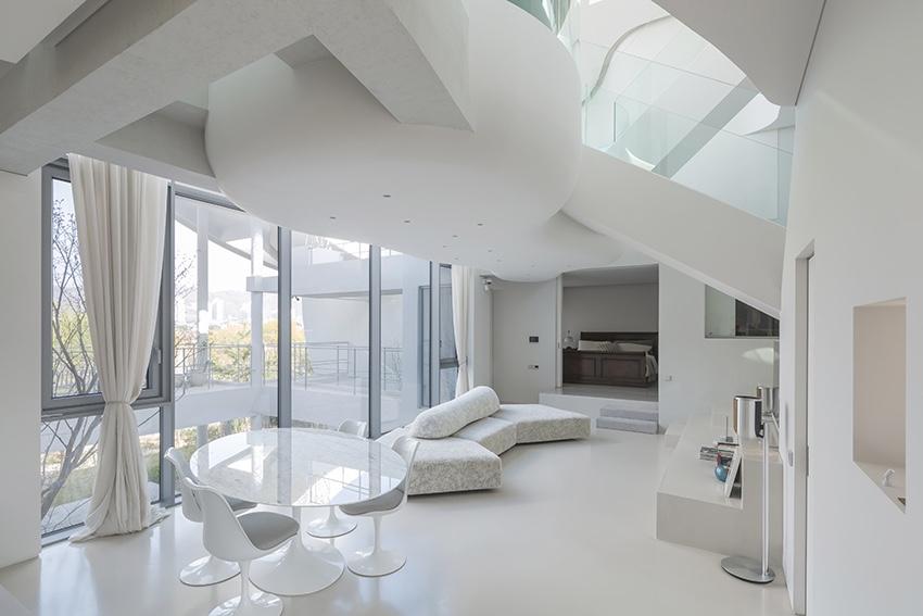 Дом спроектирован так, чтобы быть местом для уединения, но при этом поддерживать диалог с непосредственным окружением. Архитекторы переосмыслили элементы традиционной корейской архитектуры и воплотили их языком современной архитектуры.