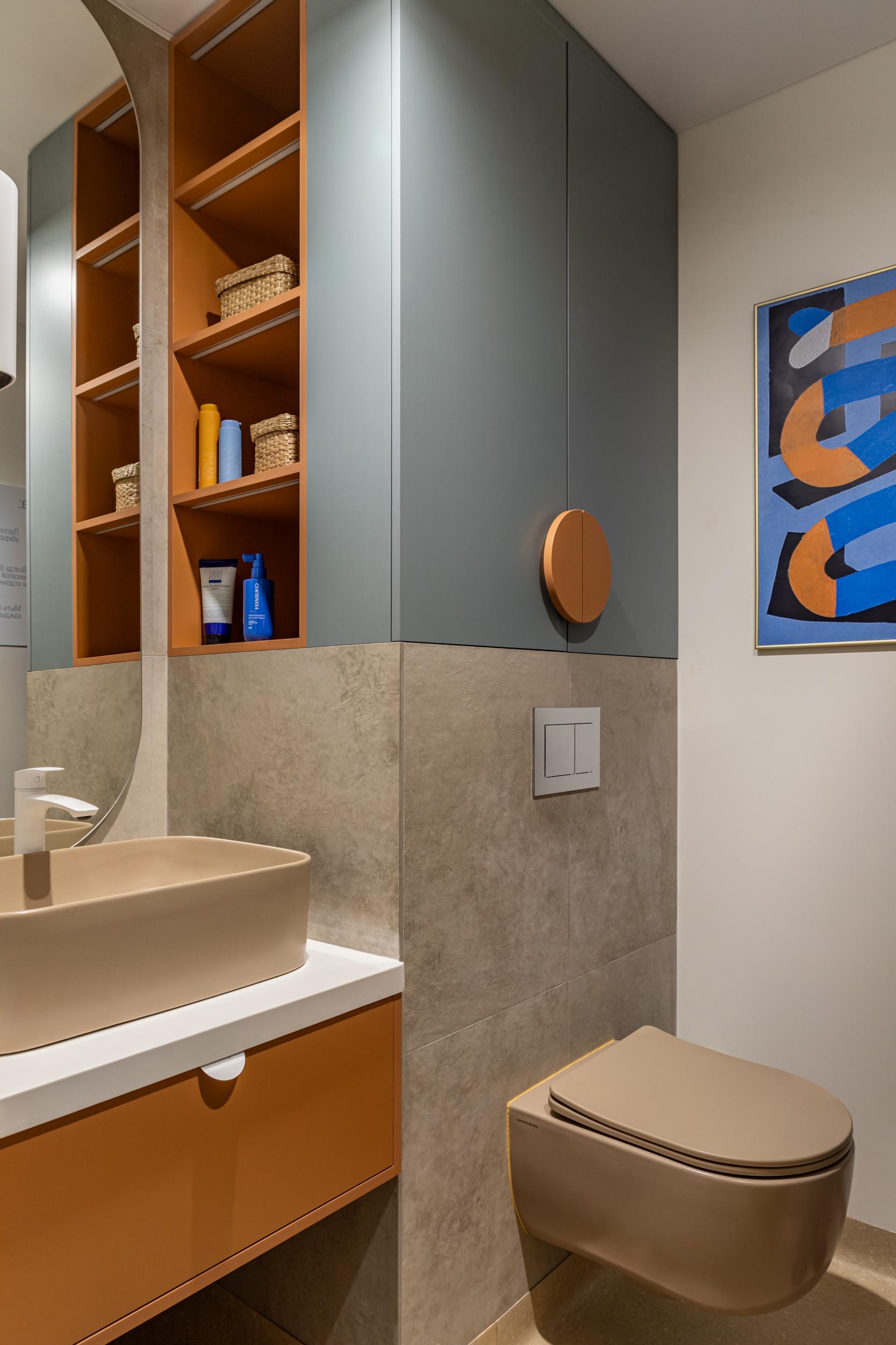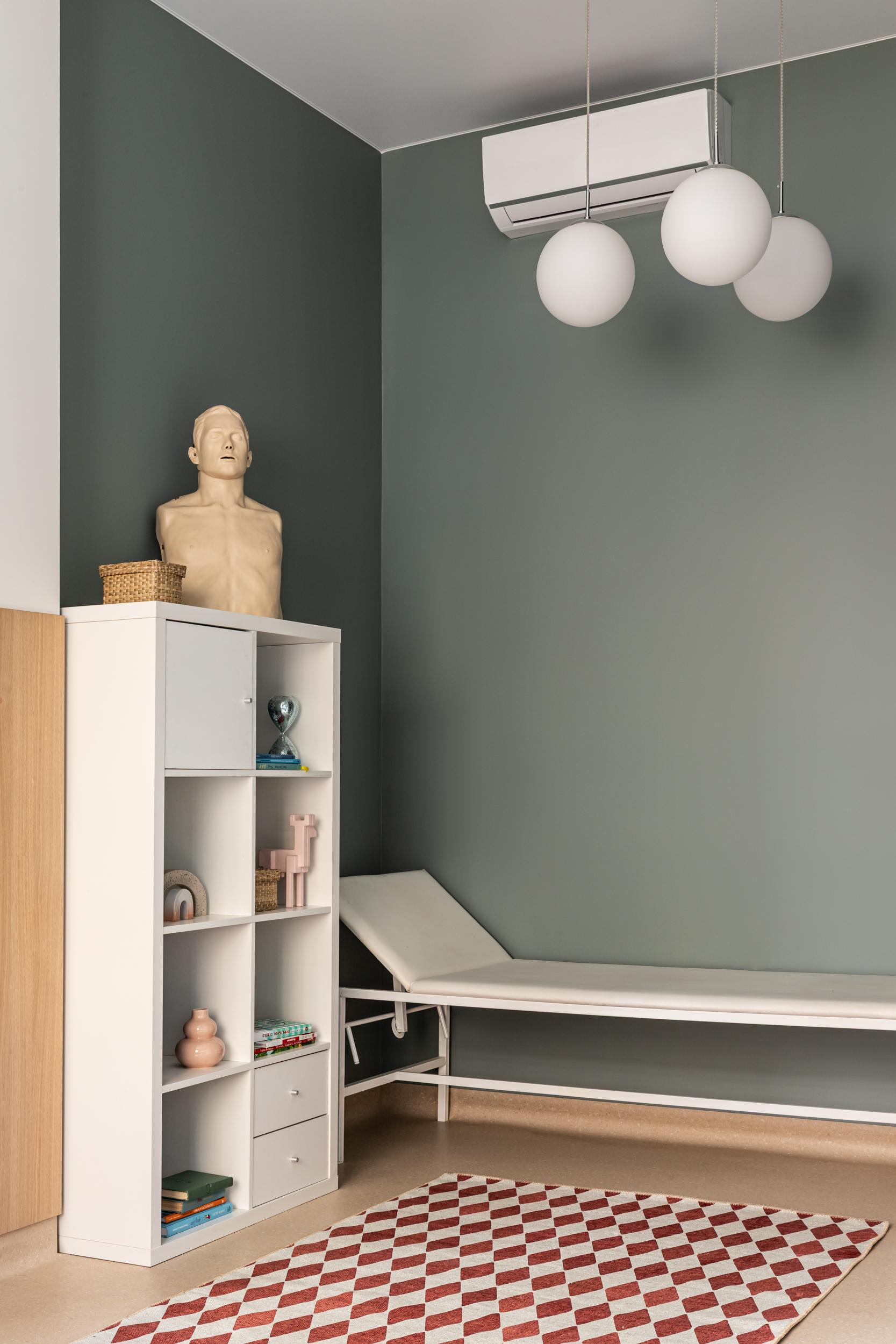 Здесь три главных цвета — нежно-голубой, серый и теплый терракотовый. Мы переосмыслили классический оттенок «врачебного» бирюзового цвета, сделали его теплее. Важную роль играют и теплые оттенки дерева — они создают атмосферу доверия.