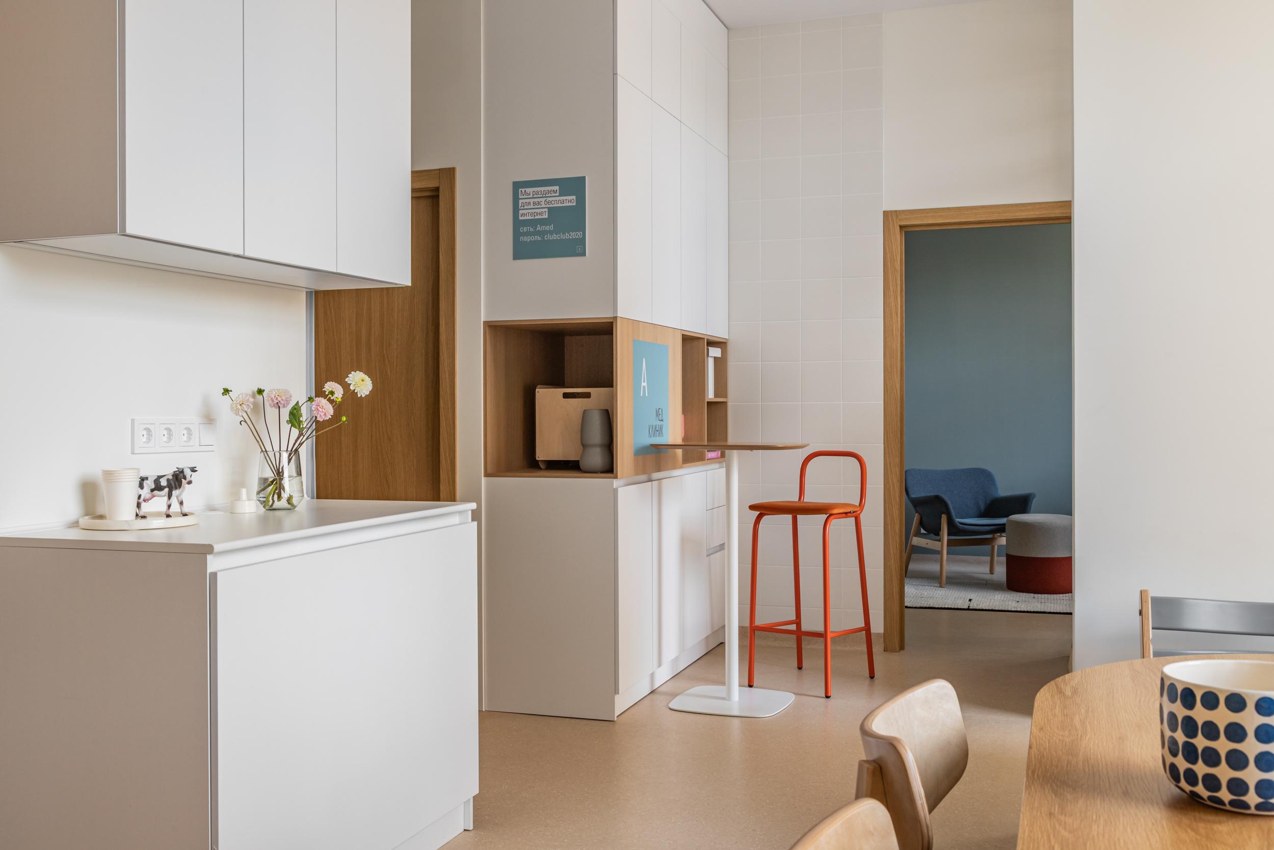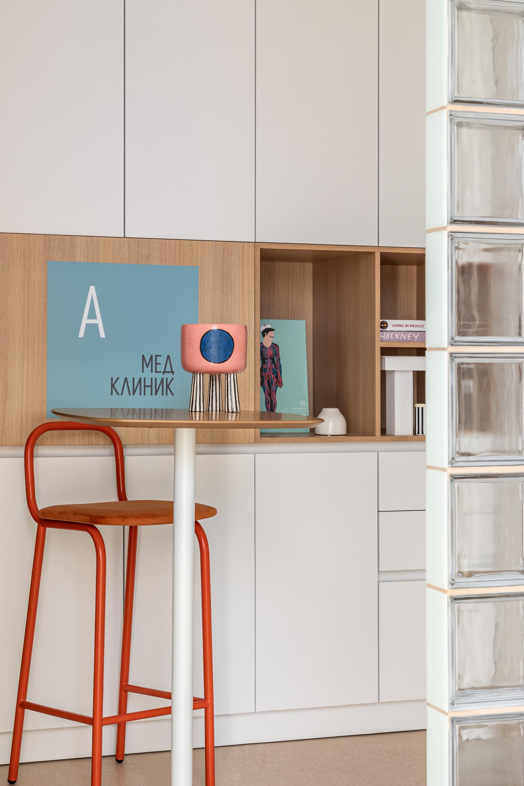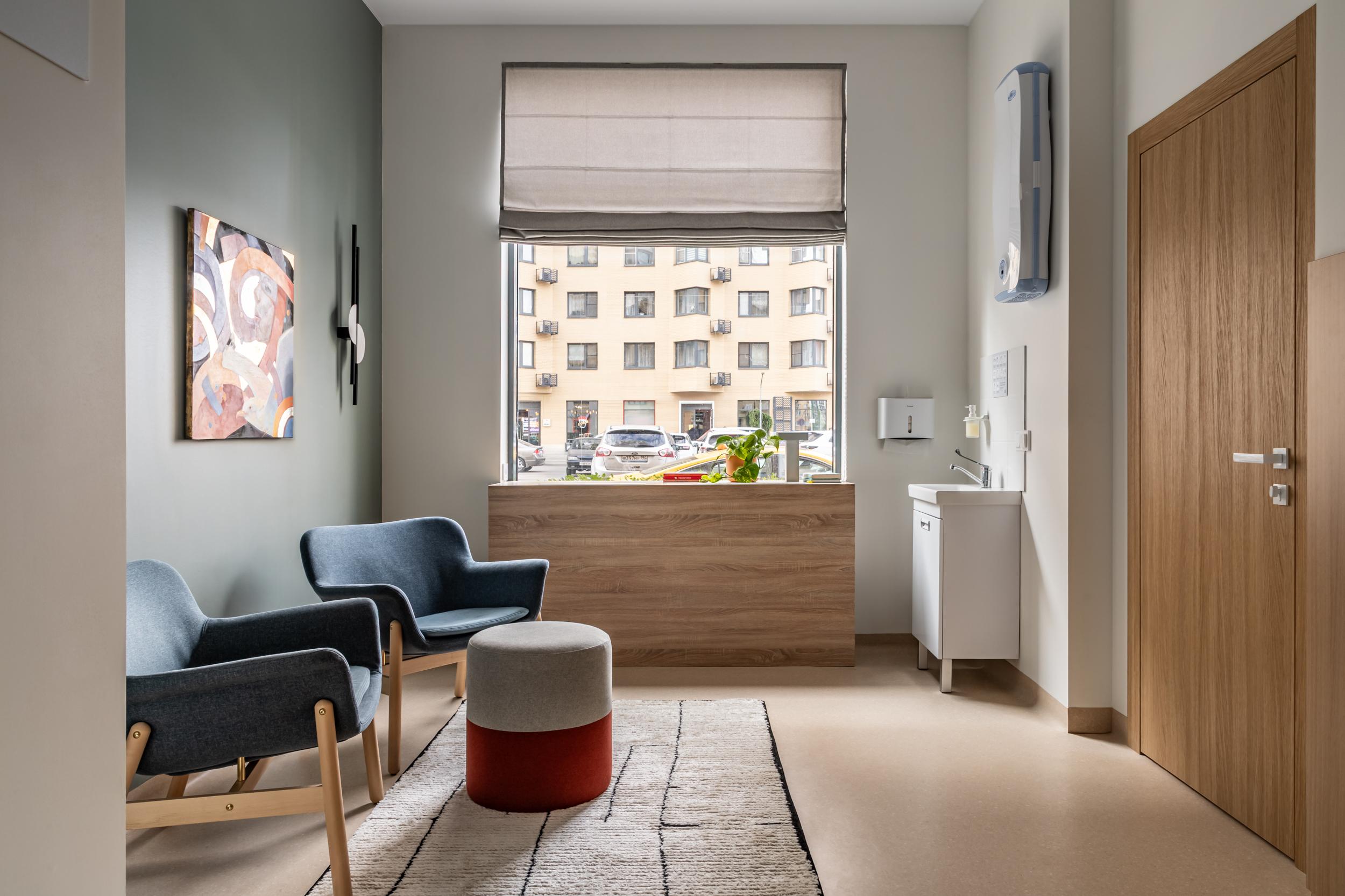 От привычной стойки администратора тоже ушли — вместо нее при входе стоит легкий барный стол и стул, создающие ощущение, что вас встречает хостес и провожает пройти в отель или ресторан, а не на прием к врачу.