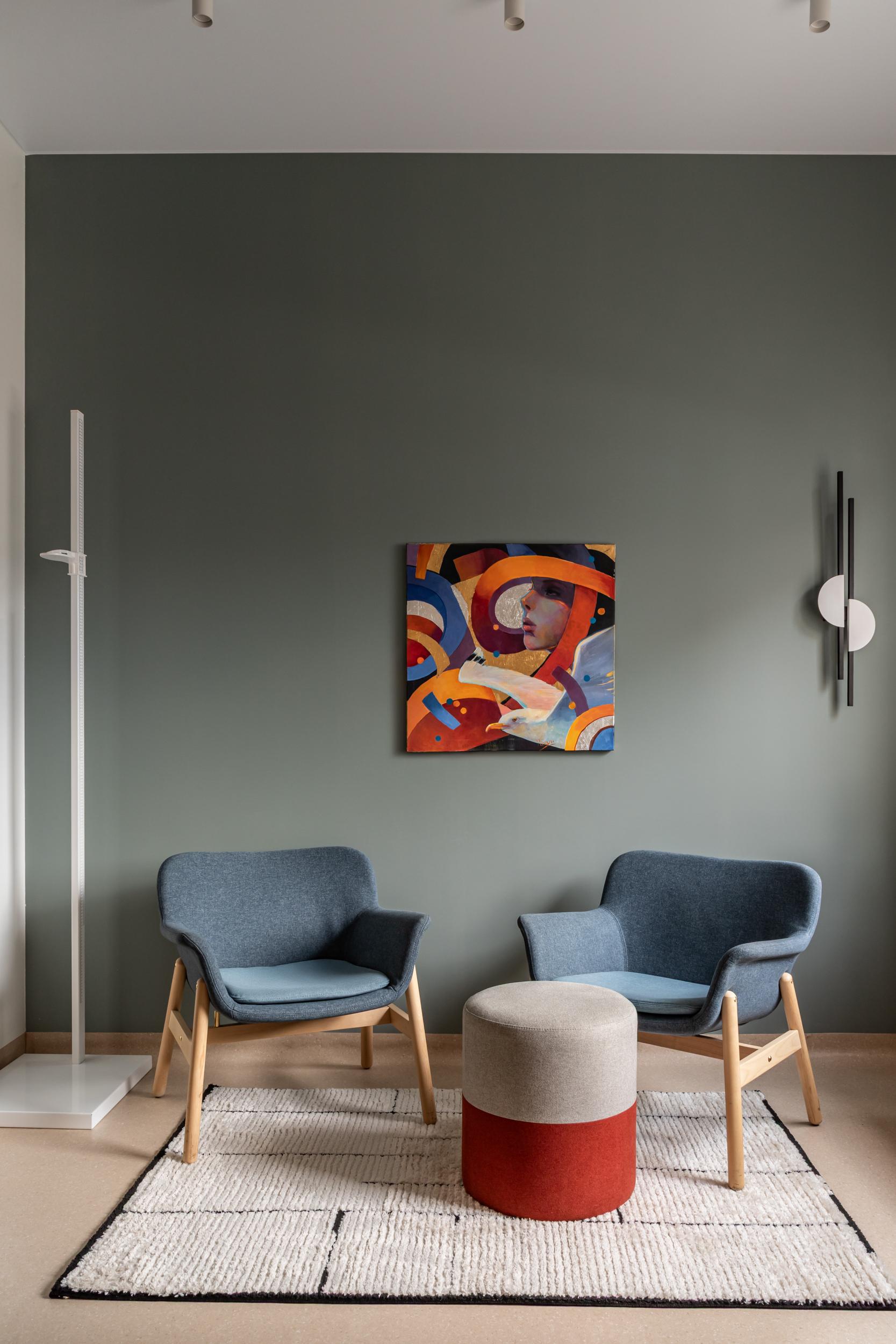 Пожелания заказчиков были достаточно необычны. Вместо привычной зоны ожидания пациентов сделали общую гостиную со столом и креслами. Здесь можно пообщаться с другими пациентами, а вечером послушать лекцию