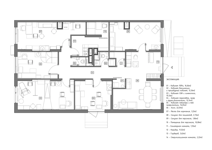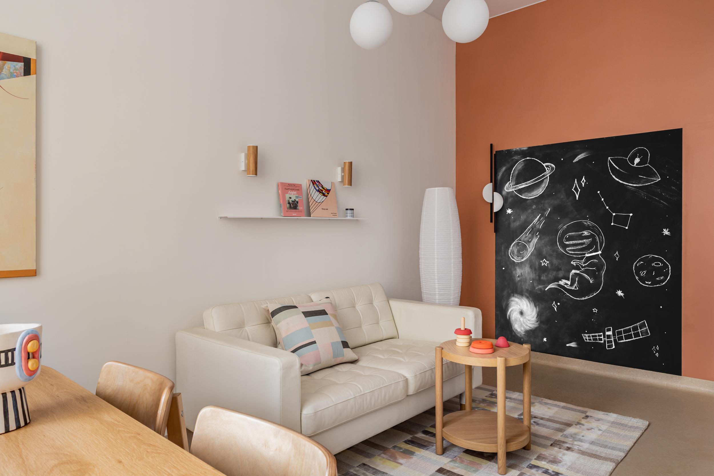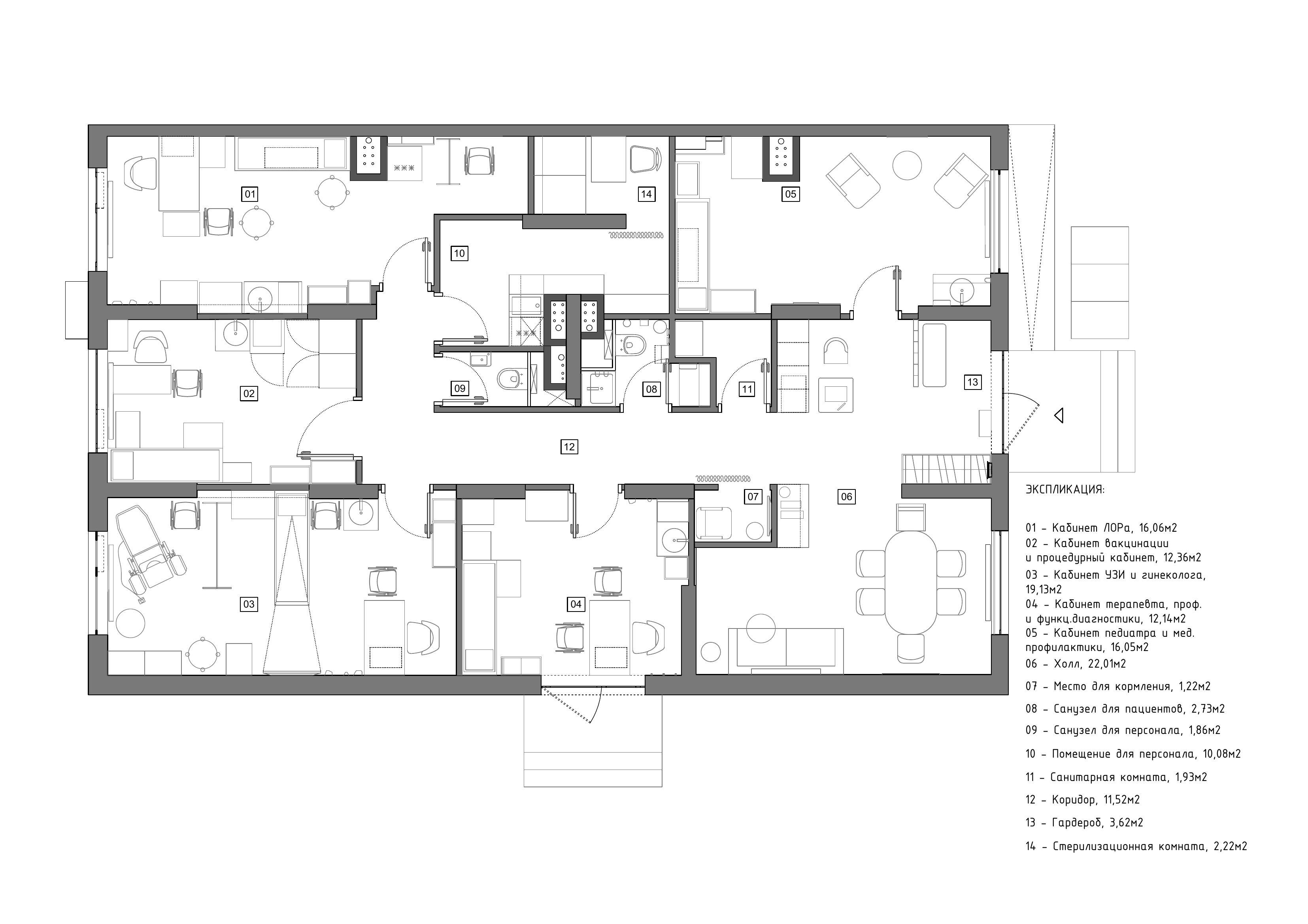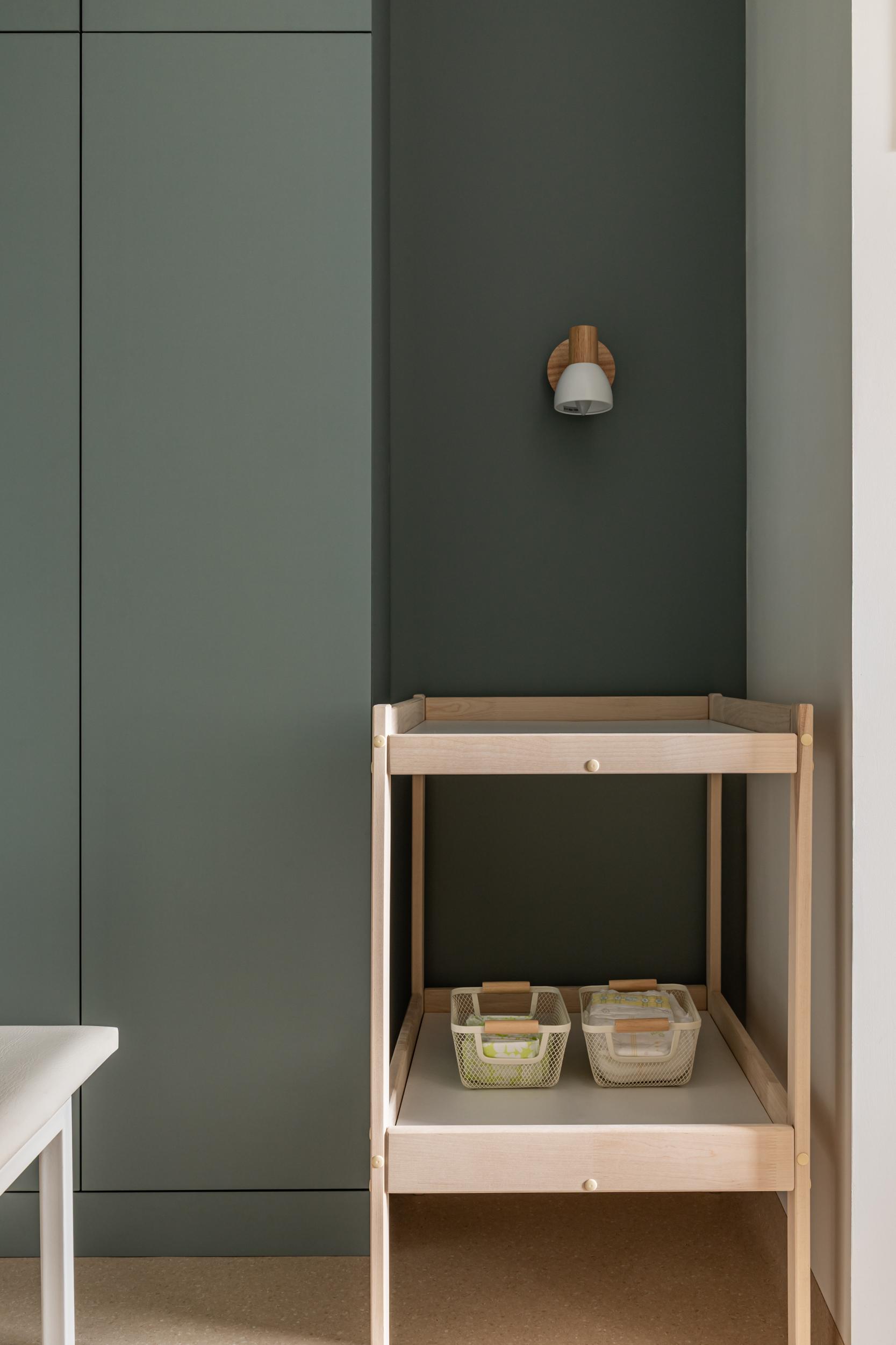Для маленьких пациентов мы предусмотрели меловую поверхность в общей зоне, где можно рисовать, а также комфортное место для кормления и все необходимое для детских расходников в санузле.