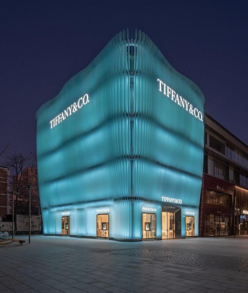 Фасад высотой 20 метров состоит из множества вертикальных панелей гнутого матового стекла характерного голубого оттенка Tiffany Blue. Каждый элемент имеет легкий изгиб, а в совокупности они создают волнообразную, слоистую поверхность. Такой подход отсылает к скульптурным ювелирным работам итальянского дизайнера Эльзы Перетти (Elsa Peretti), в частности, к ее известному браслету Bone Cuff, и превращает здание в большой арт-объект.