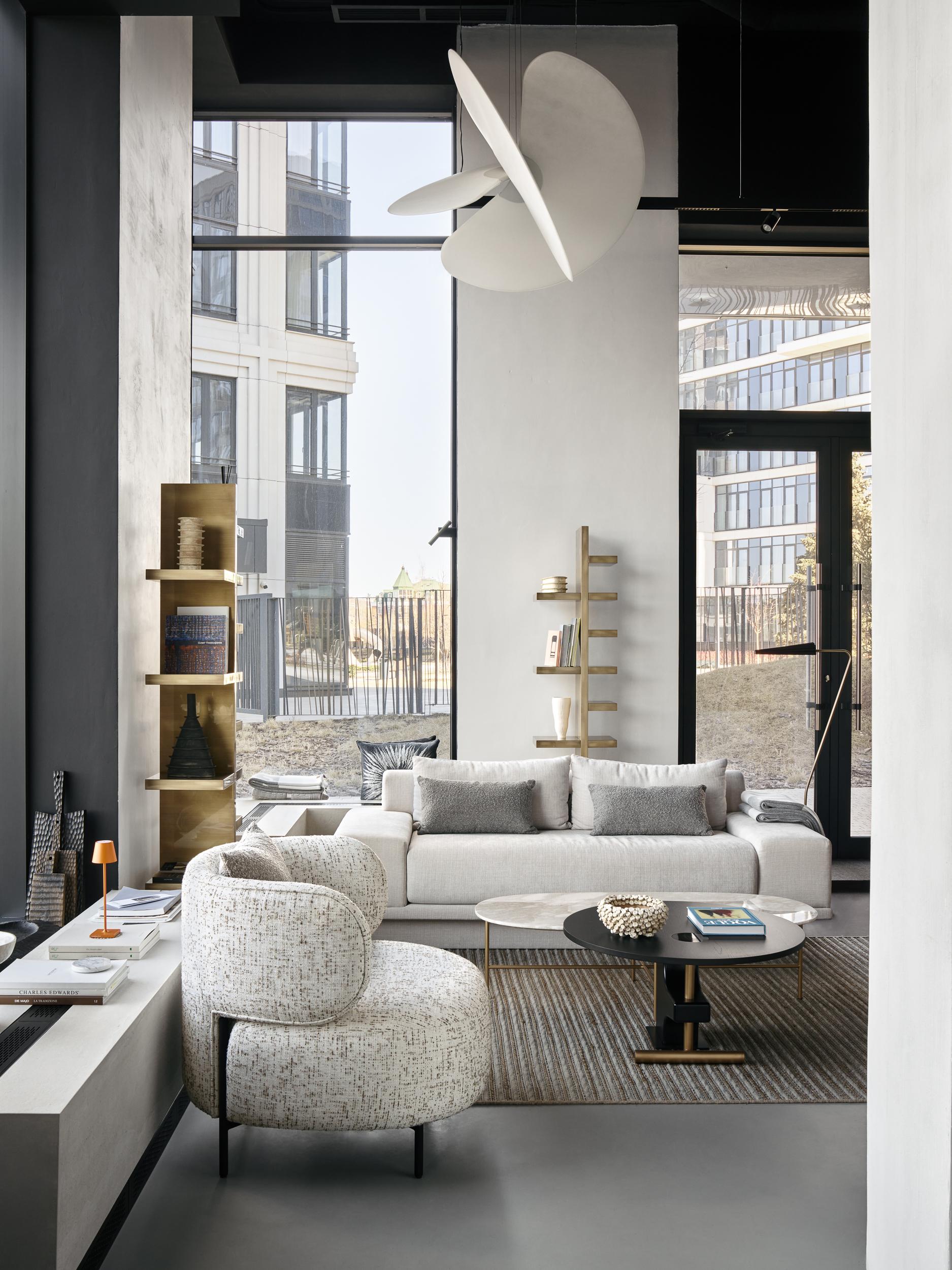 Проект не создавался в вакууме. Его характер был во многом предопределен самой локацией: «Современный интерьер галереи продиктован архитектурой жилого комплекса: высокие потолки, панорамные окна, два входа в зону галереи помогли выстроить функциональное пространство», — отмечает руководитель студии.