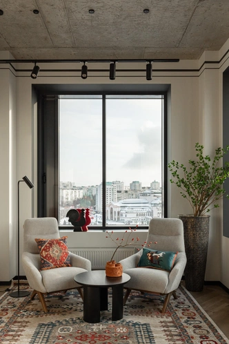 «Клиент очень боялся классического бежевого или серого офиса, как у всех, не хотелось ему и „тяжелый люкс“. Нам нужно было создать комфортное, демократичное пространство без ощущения какого-то давления и жесткой структуры, чтобы сотрудники чувствовали себя по-домашнему. Функционализм в этом интерьере сочетается с национальным колоритом. Приемы были очень простые — это росписи и микро-декор в верхней части, а также искусство от местных авторов», — рассказывает дизайнер Юлия Мусина.