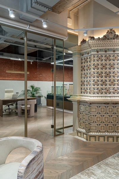 «Офис продаж ЖК „Яналиф“ расположен в бывшем доме купца Меркулова, построенном во второй половине XVIII века. Строительная компания „СМУ-88“ намерено выбрала это здание, чтобы отобразить философию комплекса, основанную на сочетании многовековой истории и современности. Пространство организовано вокруг двух изразцовых печей. Мы не прятали эти объекты наследия, напротив, подчеркнули их», — рассказывает архитектор.