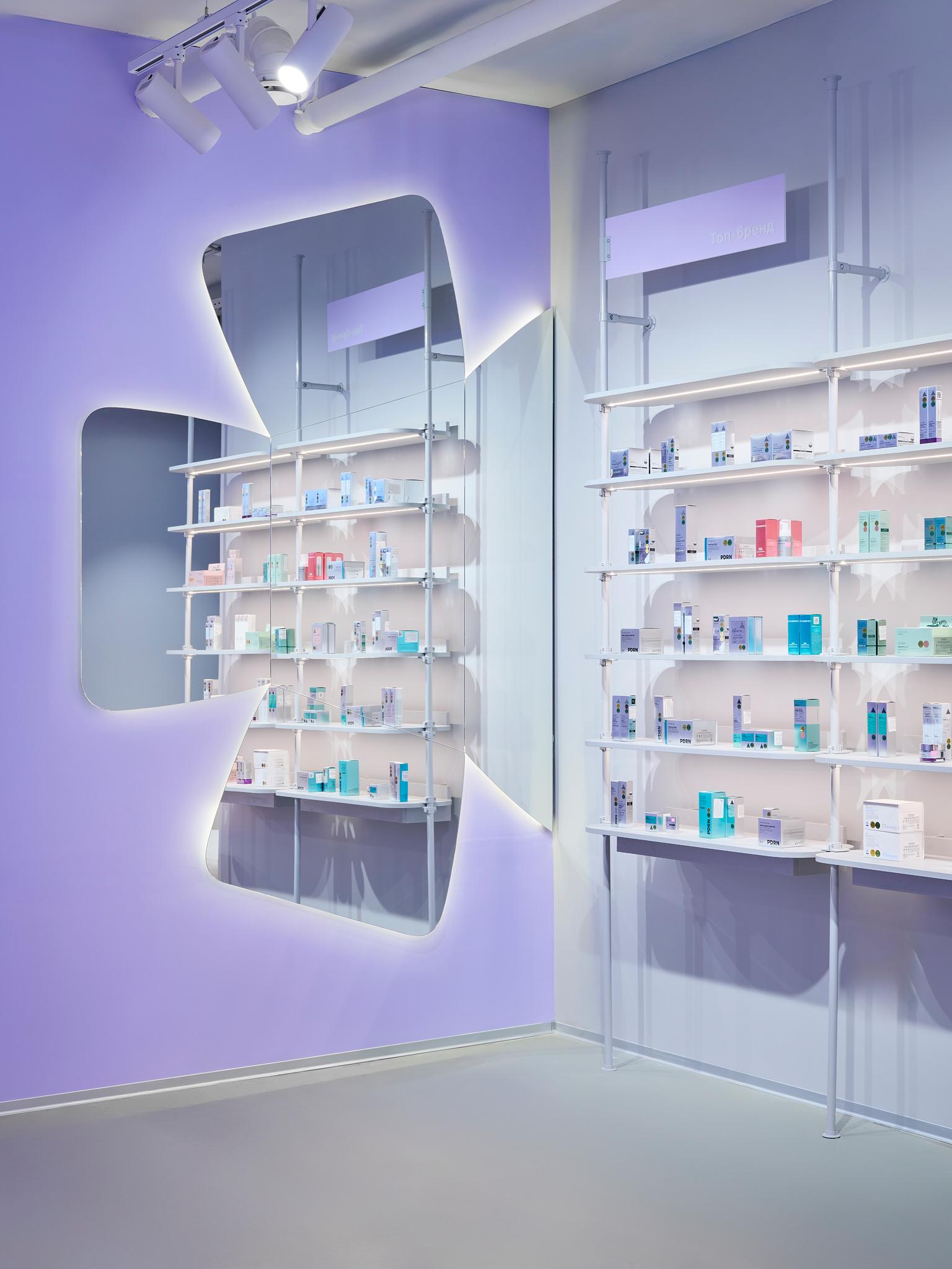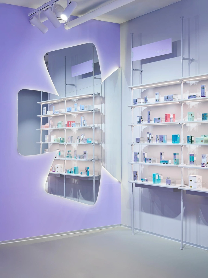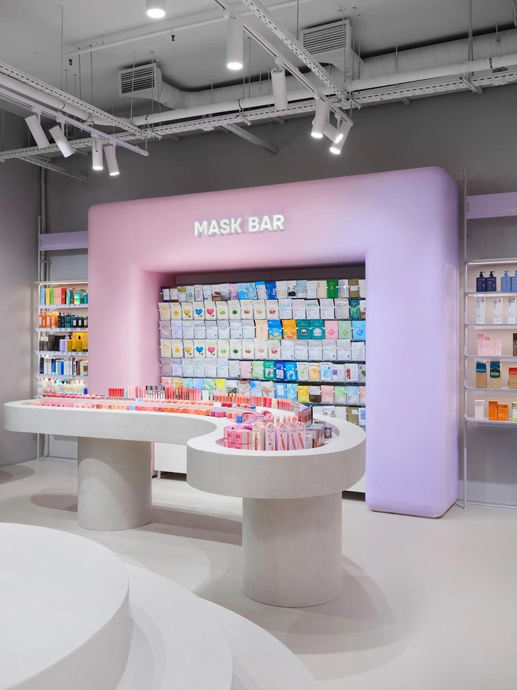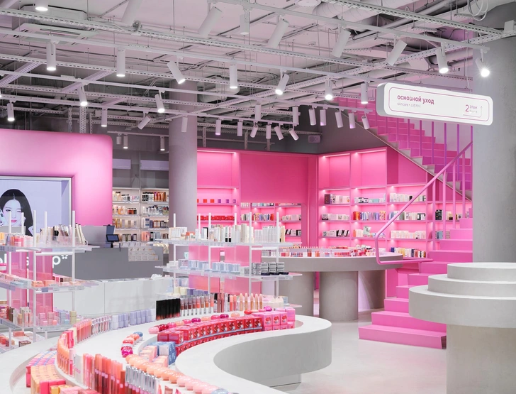 Стоит обратить внимание и на столы-«дутики» и скульптурные столы-«змейки»: «Они формируют внутри зала своеобразный маршрут — лабиринт декоративной косметики, по которому интересно двигаться, разглядывая флаконы и тестируя продукты. Такое сочетание рациональной экспозиции и игровых форм делает пространство одновременно функциональным и вовлекающим», — рассказывают дизайнеры.