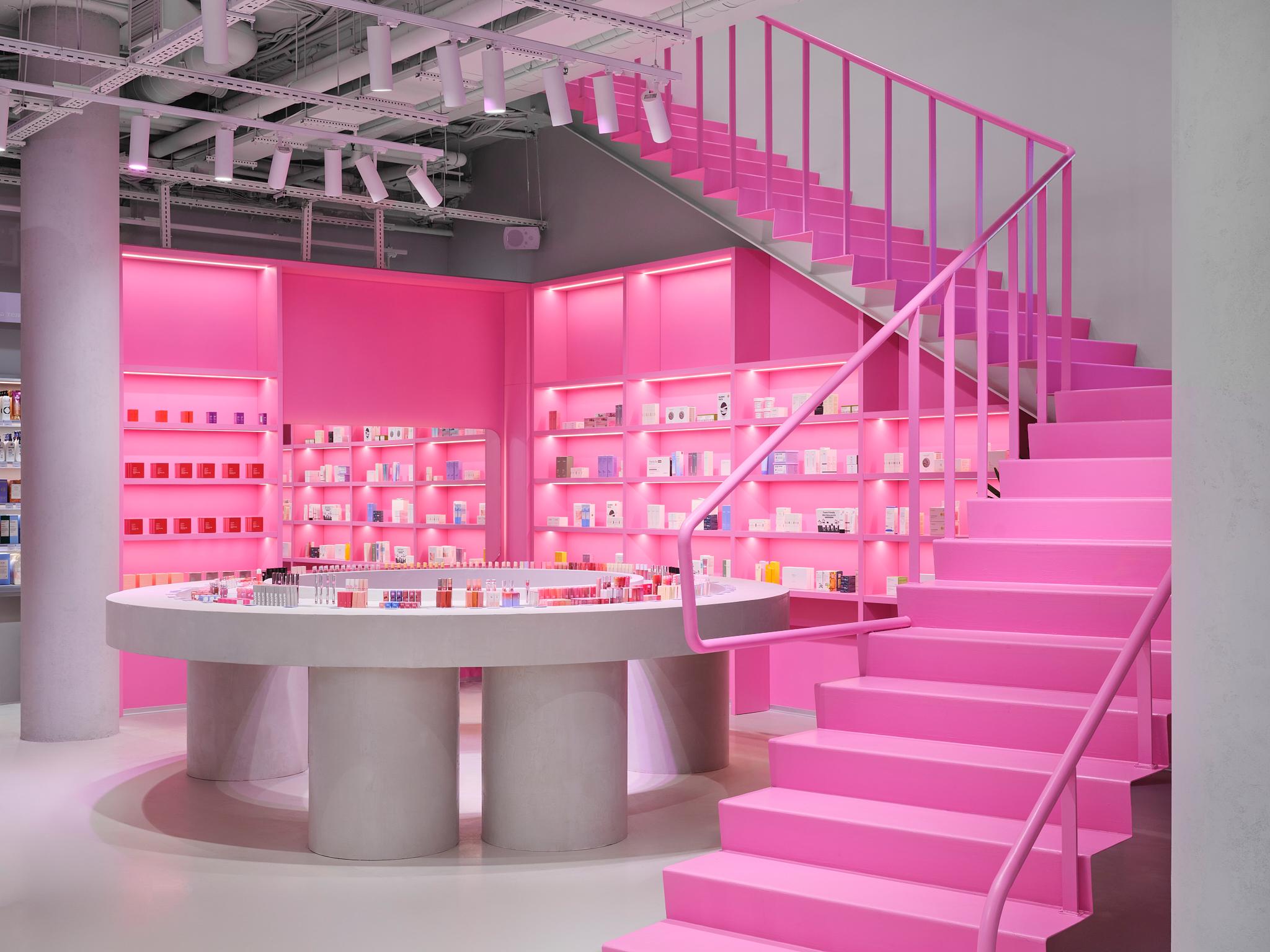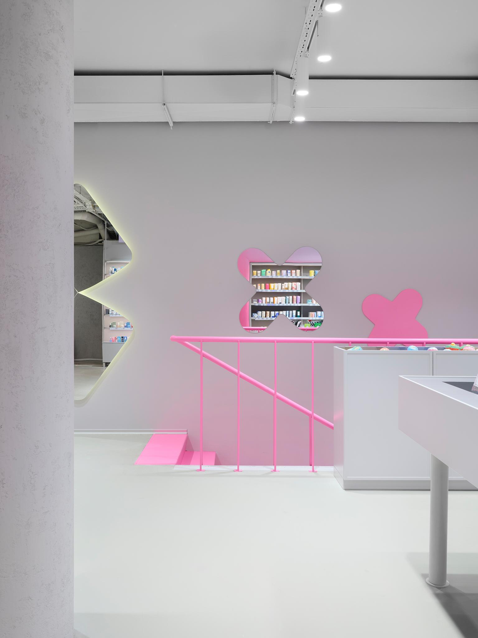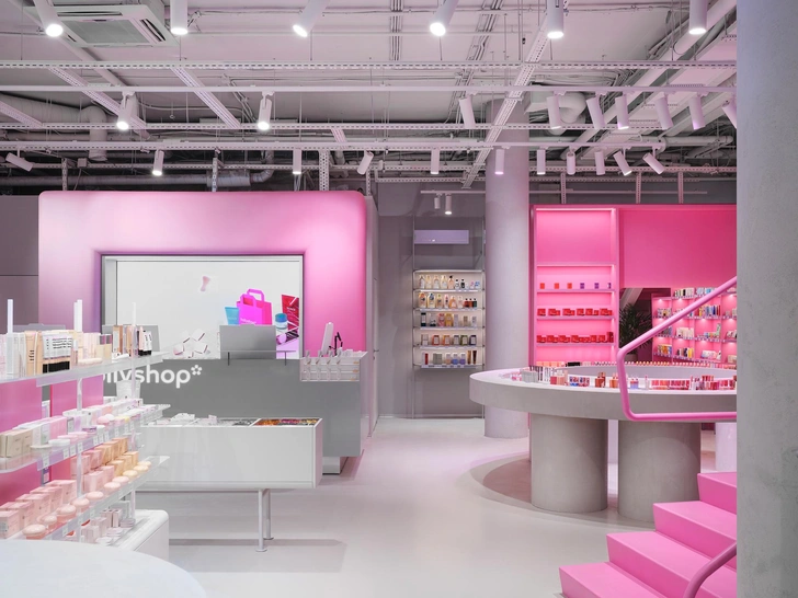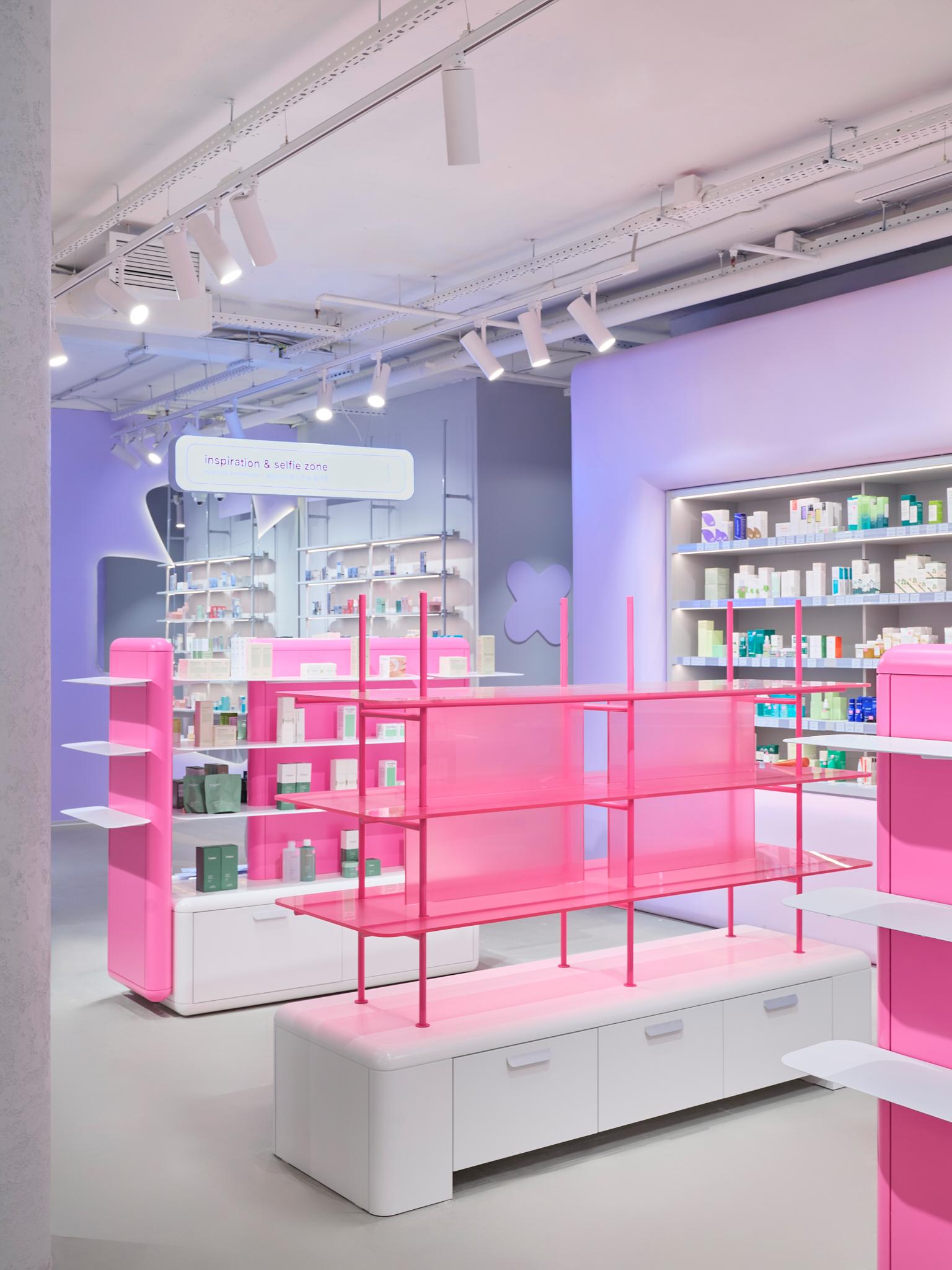 Стоит обратить внимание и на столы-«дутики» и скульптурные столы-«змейки»: «Они формируют внутри зала своеобразный маршрут — лабиринт декоративной косметики, по которому интересно двигаться, разглядывая флаконы и тестируя продукты. Такое сочетание рациональной экспозиции и игровых форм делает пространство одновременно функциональным и вовлекающим», — рассказывают дизайнеры.