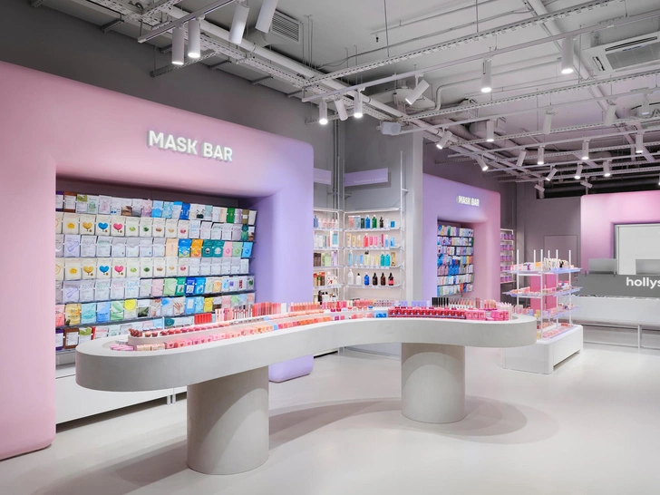 Команда Sinitsa buro не в первый раз работает с магазинами Hollyshop, так что многие интерьерные решения прошли проверку временем. Новый магазин на Петроградской стороне в Санкт-Петербурге занимает два этажа, и у каждого своя атмосфера. Первый этаж — с яркими цветами и динамичными формами. Второй — более нежный, с мягкими градиентами и спокойной атмосферой. Такое решение создает интересный переход от насыщенного входного уровня к более камерному пространству наверху.