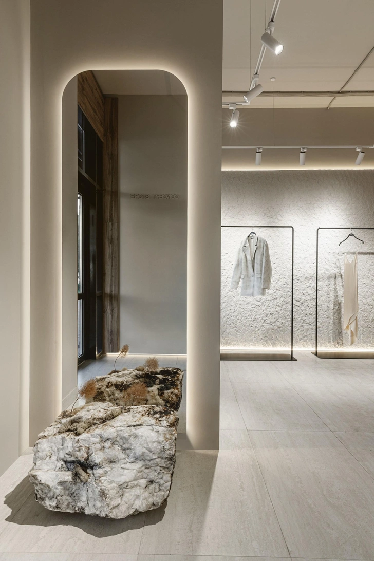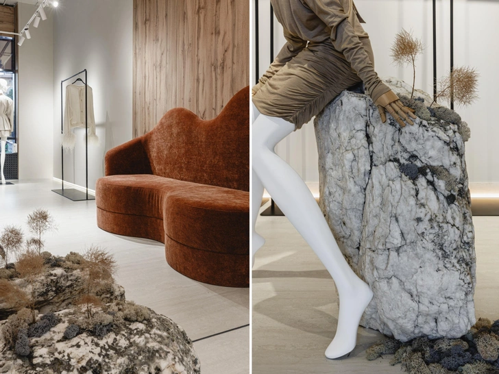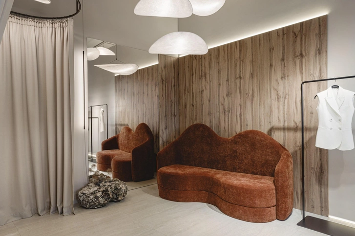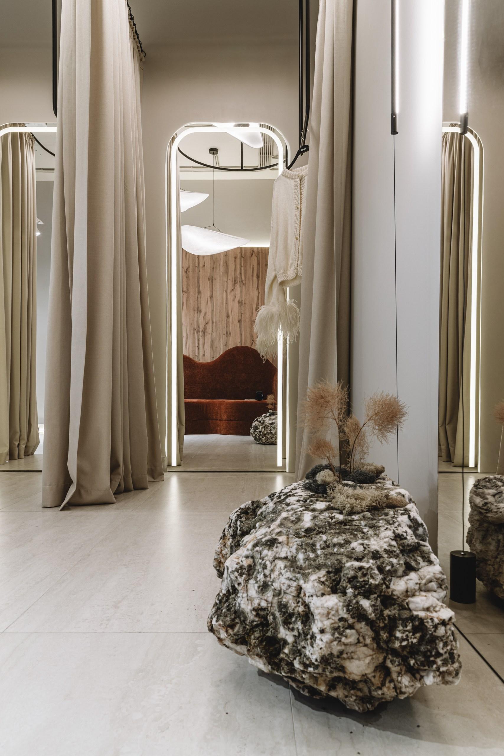Примерочные мы оформили легким текстилем: это не только помогло сэкономить, но и — самое главное — создало ощущение легкости, уюта. Здесь нет ничего загромождающего — и даже массивные камни не утяжеляют, а, напротив, создают интересный контраст между грубым и мягким. Помню, как мы выбирали эти камни: было это в сорокоградусную краснодарскую жару. Солнце их настолько накалило, что от них шел какой-то пар — казалось, что находишься в бане. Никогда не забуду лицо продавца, уже бордовое от такой изнуряющей погоды.